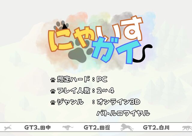 にゃいす にゃいす ガイ ガイ 想定ハード:PC プレイ人数:2~4 ジャンル :オンライン3D バトルロワイヤル 想定ハード:PC プレイ人数:2~4
