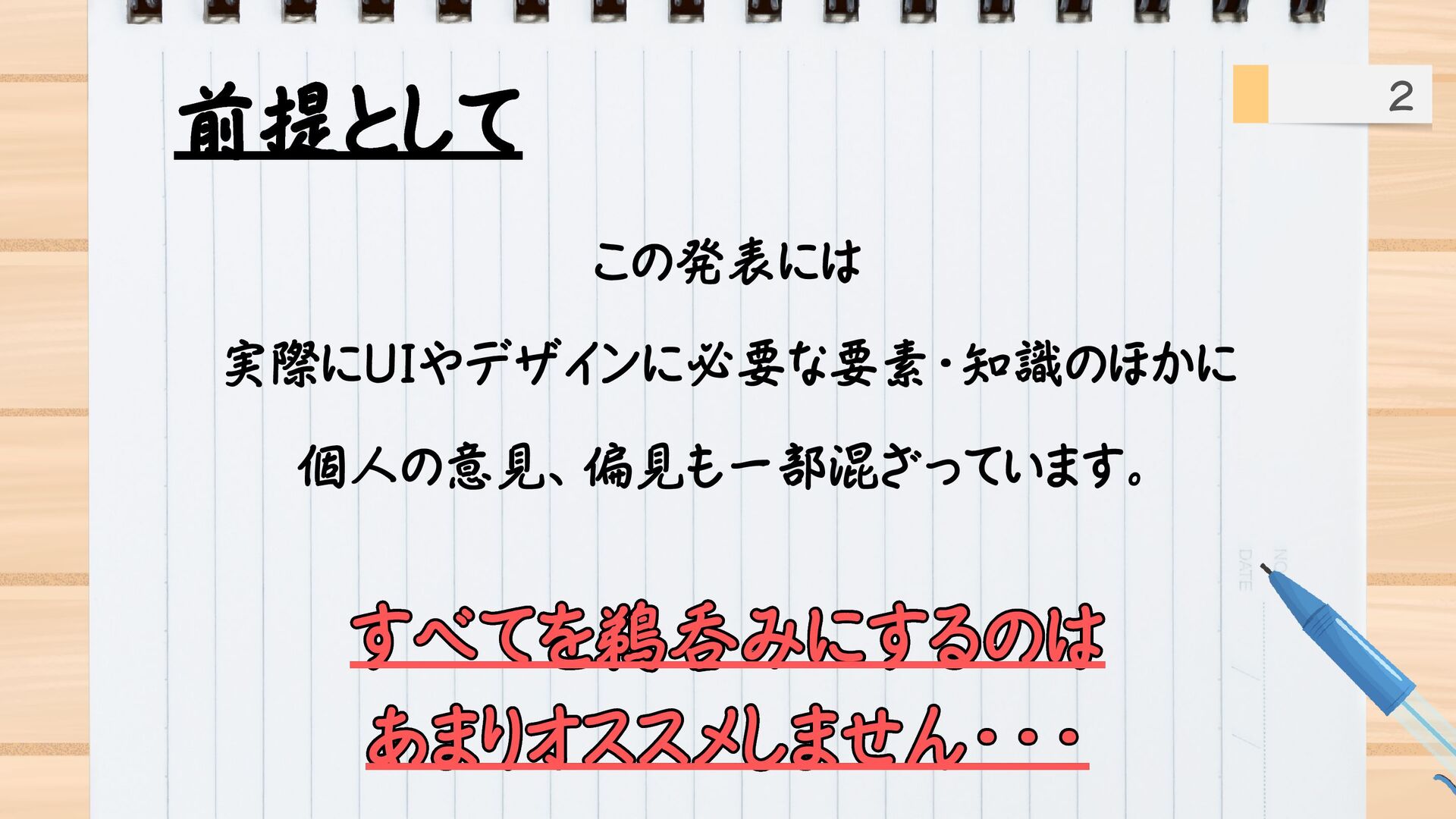前提として 前提として 2 この発表には 実際にUIやデザインに必要な要素・知識のほかに 個人の意見、偏見も一部混ざっています。 すべてを鵜呑みにするのは あまりオススメしません・・・ すべてを鵜呑みにするのは あまりオススメしません・・・