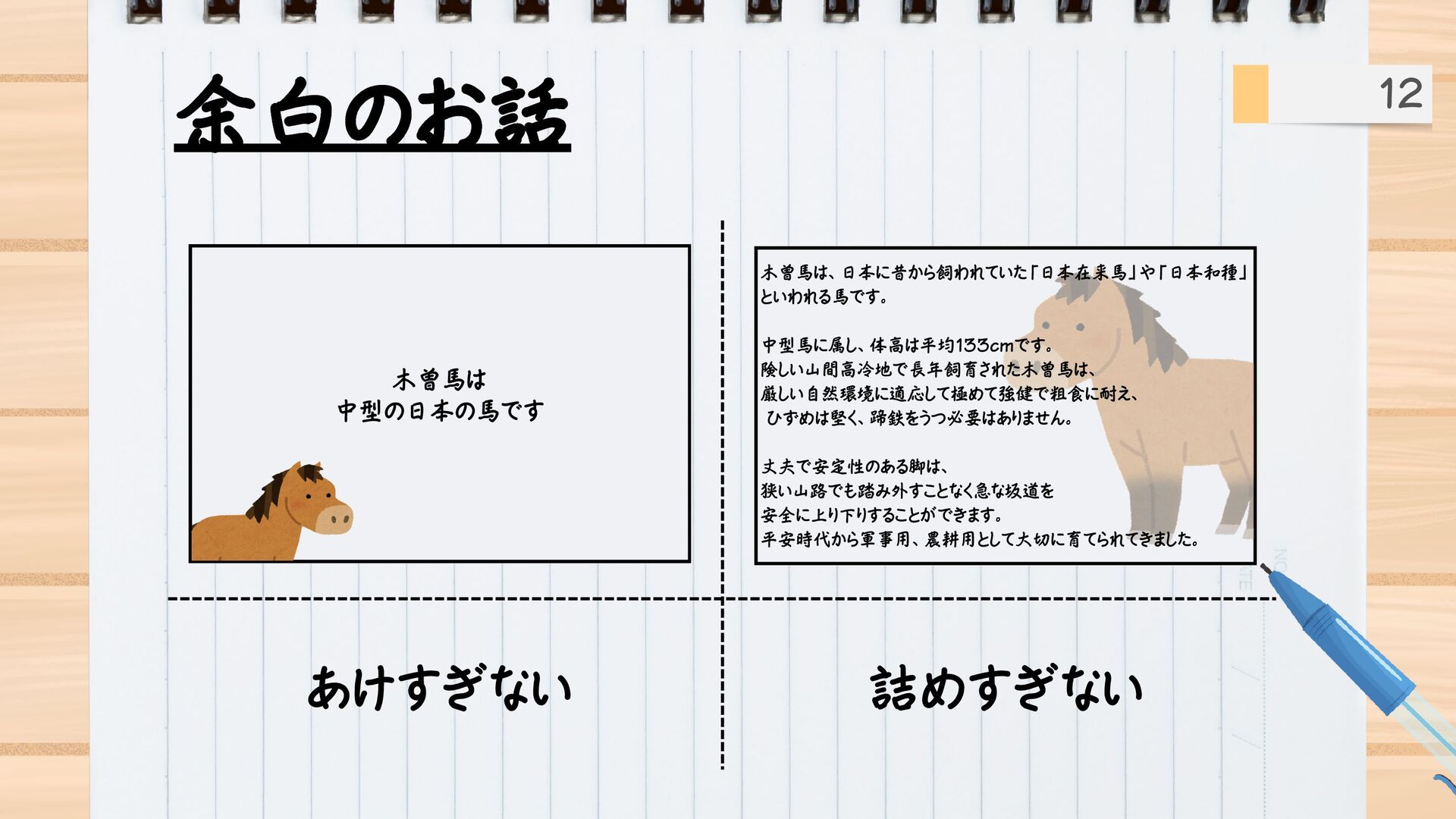 余白のお話 余白のお話 12 あけすぎない 詰めすぎない 木曽馬は、日本に昔から飼われていた「日本在来馬」や「日本和種」 といわれる馬です。 中型馬に属し、体高は平均133cmです。 険しい山間高冷地で長年飼育された木曽馬は、 厳しい自然環境に適応して極めて強健で粗食に耐え、