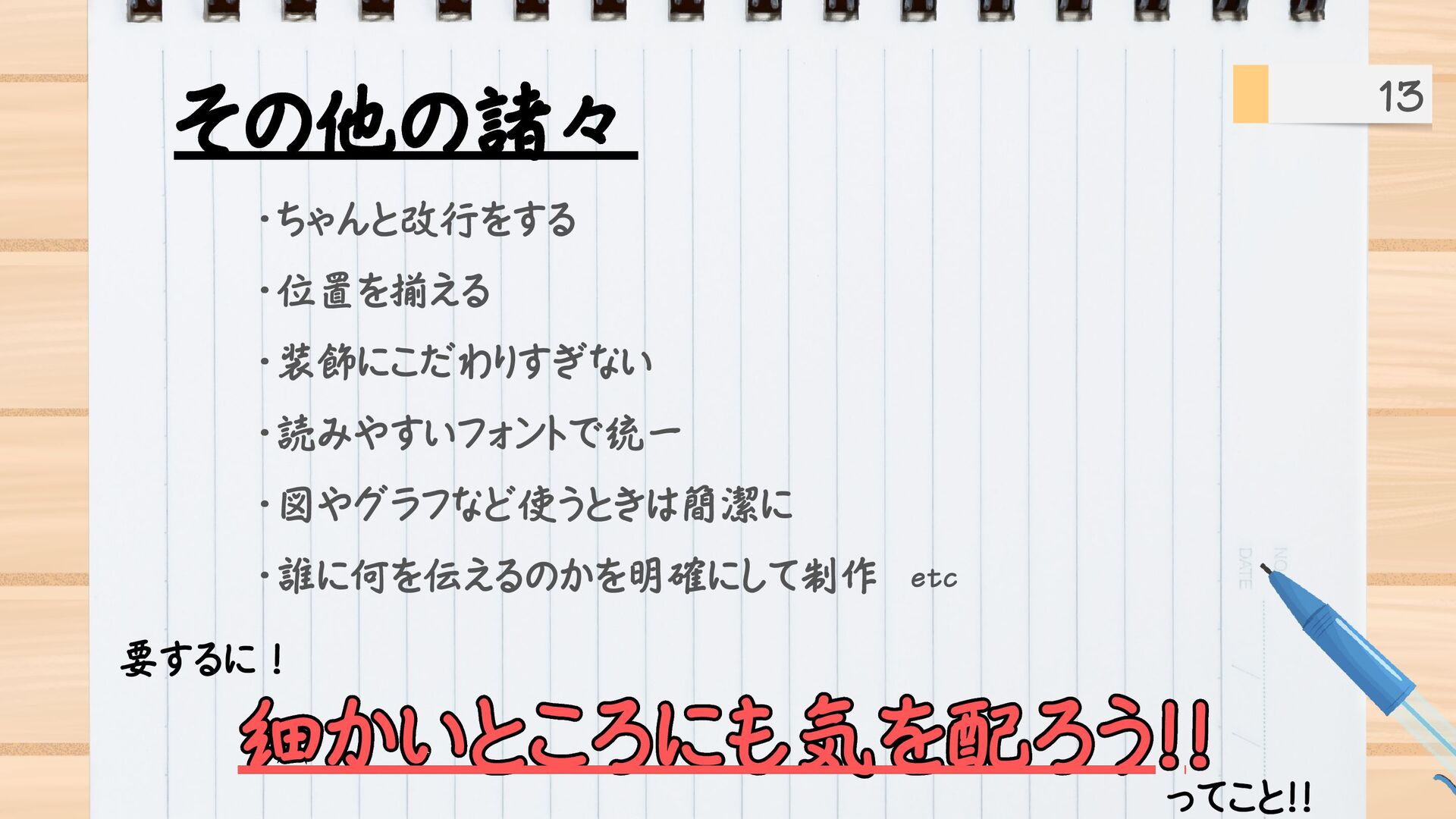その他の諸々 その他の諸々 13 ・ちゃんと改行をする ・位置を揃える ・装飾にこだわりすぎない ・読みやすいフォントで統一 ・図やグラフなど使うときは簡潔に ・誰に何を伝えるのかを明確にして制作 etc