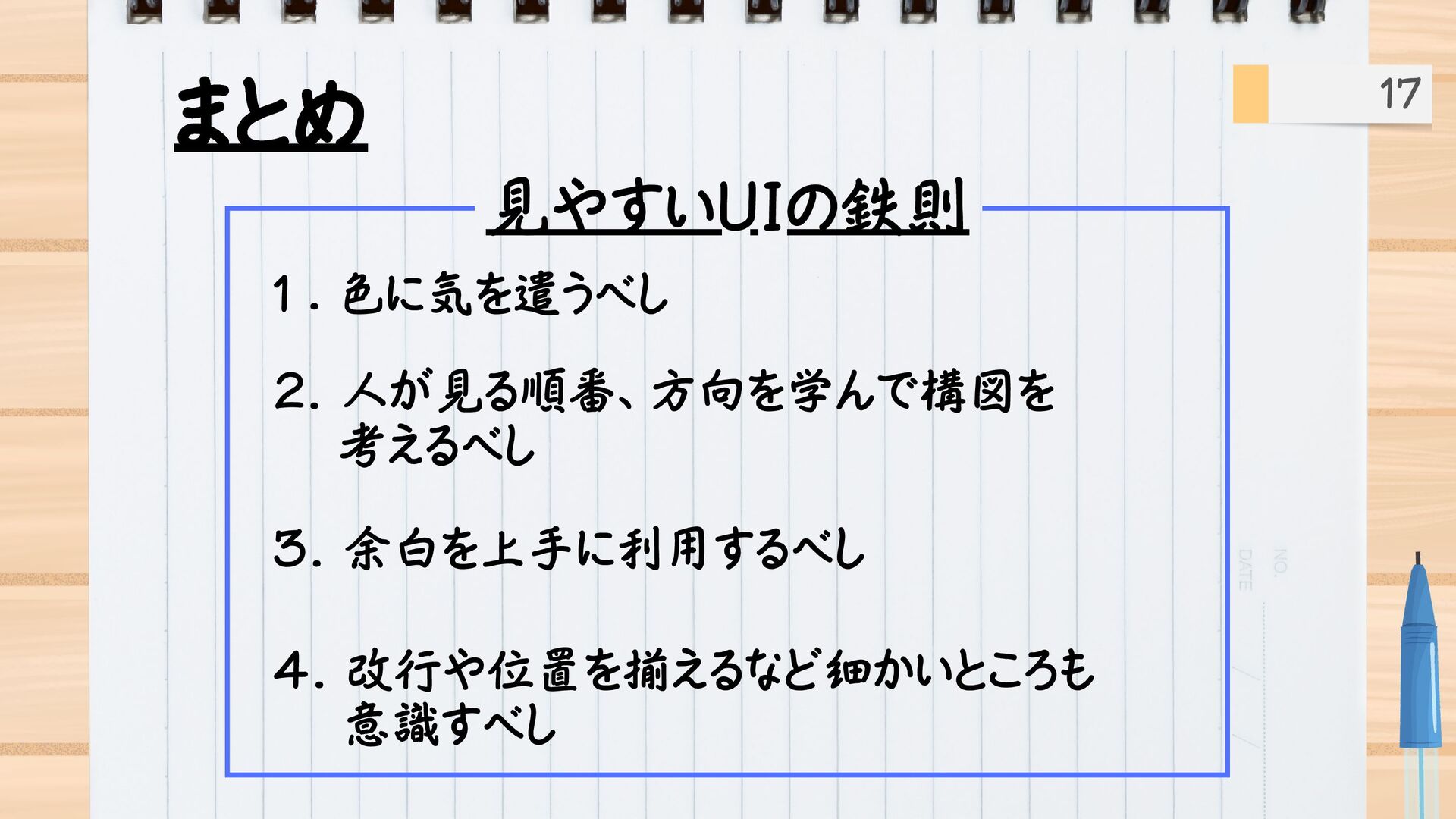 まとめ まとめ 17 見やすいUIの鉄則 1 .色に気を遣うべし 2. 人が見る順番、方向を学んで構図を 考えるべし