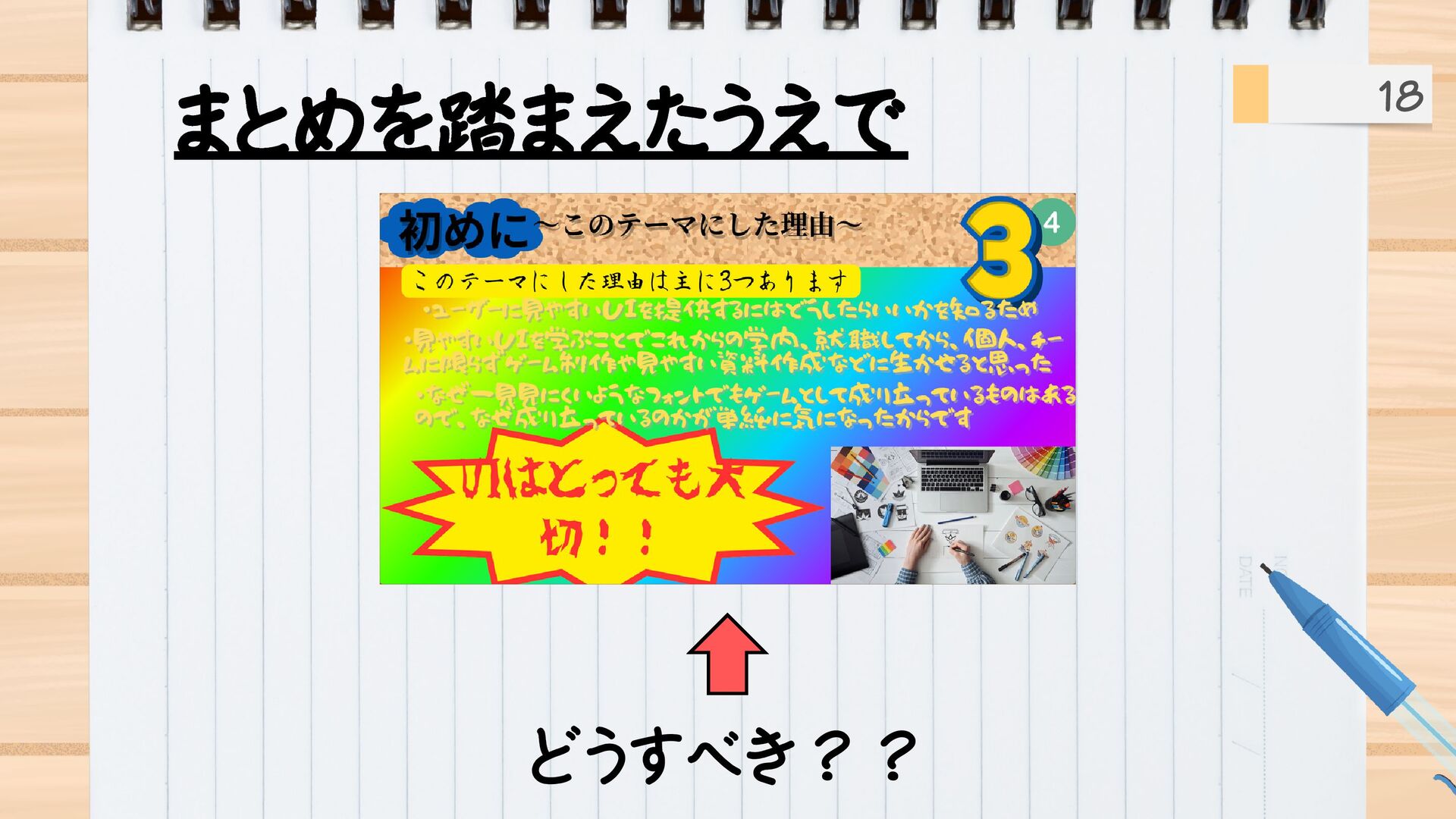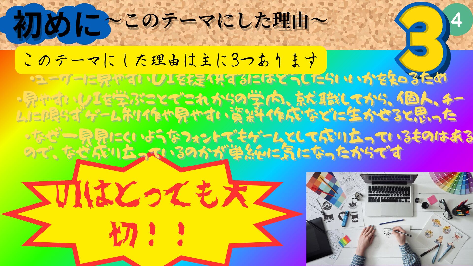 ・見やすいUIを学ぶことでこれからの学内、就職してから、個人、チー ・見やすいUIを学ぶことでこれからの学内、就職してから、個人、チー ムに限らずゲーム制作や見やすい資料作成などに生かせると思った ムに限らずゲーム制作や見やすい資料作成などに生かせると思った 初めに~このテーマにした理由~ このテーマにした理由は主に3つあります