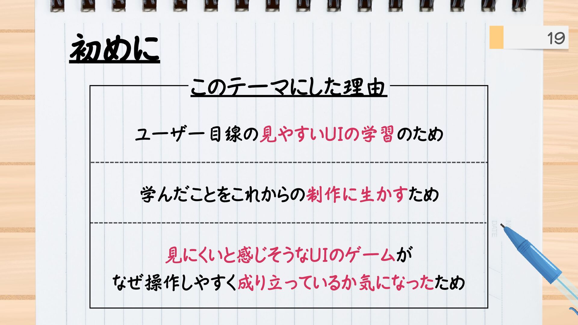 初めに 初めに 19 このテーマにした理由 ユーザー目線の見やすいUIの学習のため 学んだことをこれからの制作に生かすため 見にくいと感じそうなUIのゲームが なぜ操作しやすく成り立っているか気になったため