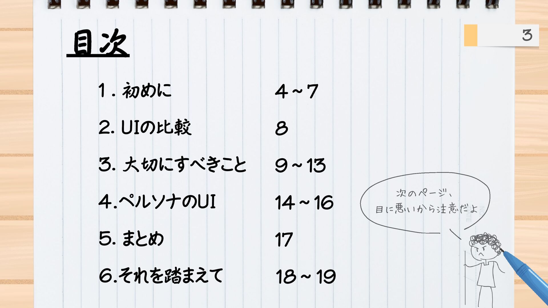 次のページ、 目に悪いから注意だよ 1 .初めに 2.UIの比較 3.大切にすべきこと 4.ペルソナのUI 5.まとめ 6.それを踏まえて 4~7