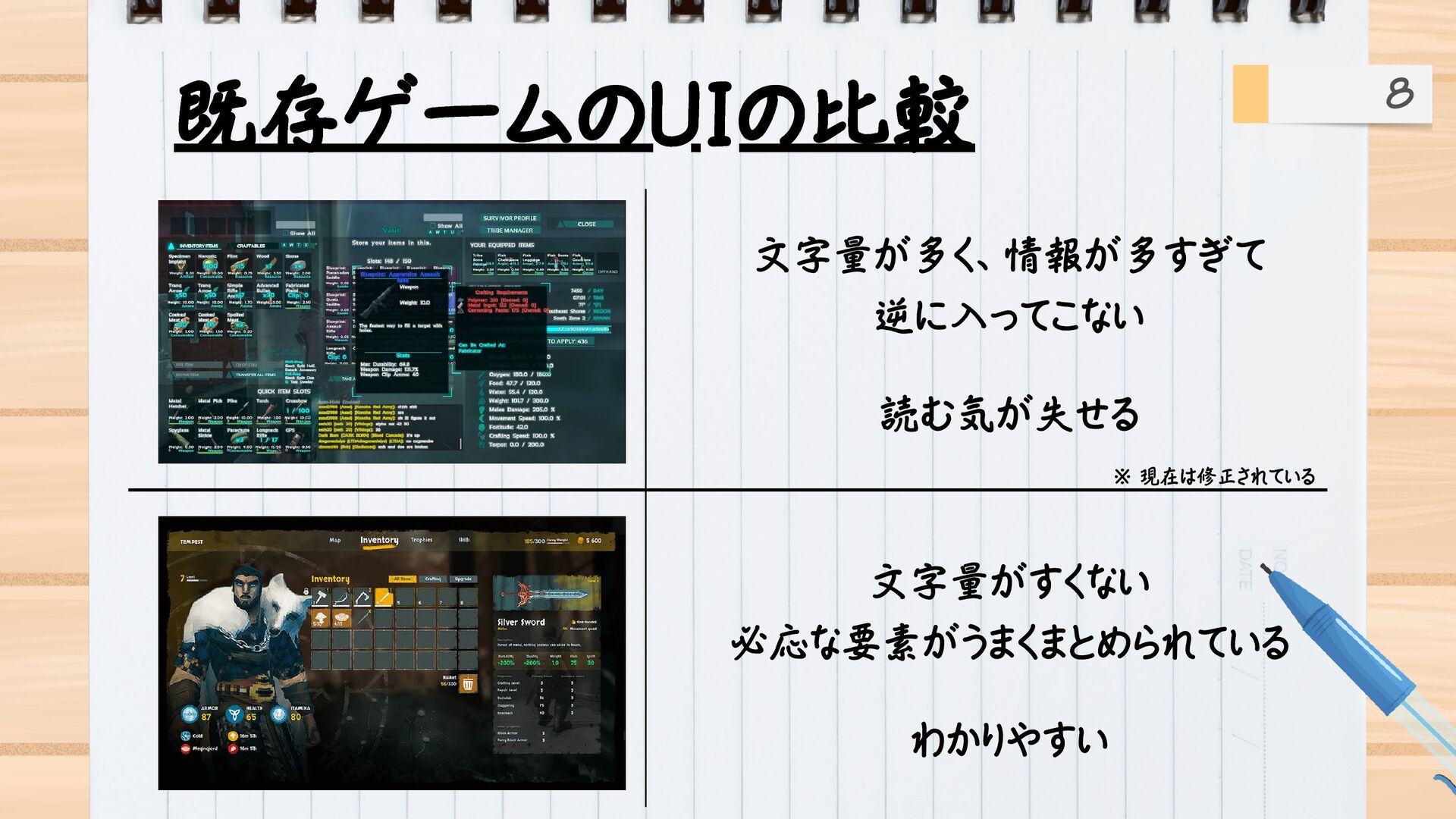 既存ゲームのUIの比較 既存ゲームのUIの比較 8 文字量が多く、情報が多すぎて 逆に入ってこない 読む気が失せる ※ 現在は修正されている 文字量がすくない 必応な要素がうまくまとめられている
