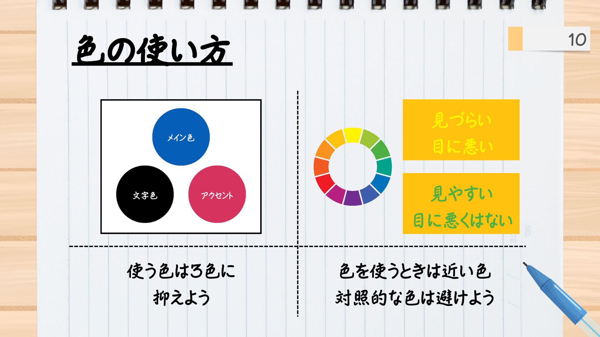 色の使い方 色の使い方 10 使う色は3色に 抑えよう 色を使うときは近い色 対照的な色は避けよう メイン色 文字色 アクセント