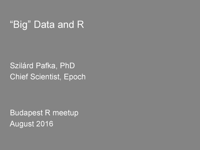 of RAM (physical/ cloud) - Use R and high performance R packages (e.g. data. table, xgboost) - Do data reduction in database (analytical db/ big data system) - (Only) distribute embarrassingly parallel tasks (e.g. hyperparameter search for machine learning) - Let engineers (store and) ETL the data (“scalable”) - Use statistics/ domain knowledge/ thinking - Use “big data tools” only if the above tips not enough