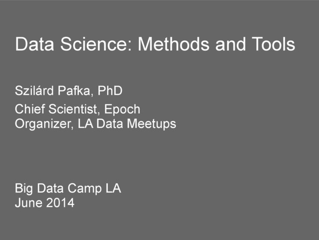 200 people • Data munging: R 60%, Python 50%, SQL 40%, Hadoop (mostly Hive) 30%, Unix shell 20%, Excel 10% + Perl, Matlab, SAS, Impala, Pig, Shark... • Visualization: R 40%,Python 30%, Tableau 10%, Javascript 10% + Matlab, Excel... • Machine learning/modeling: R 30%, Python 30% + Vowpal Wabbit, Matlab, Mahout, SAS, SPSS... http://bit.ly/datasc-tools-survey many other surveys, but...