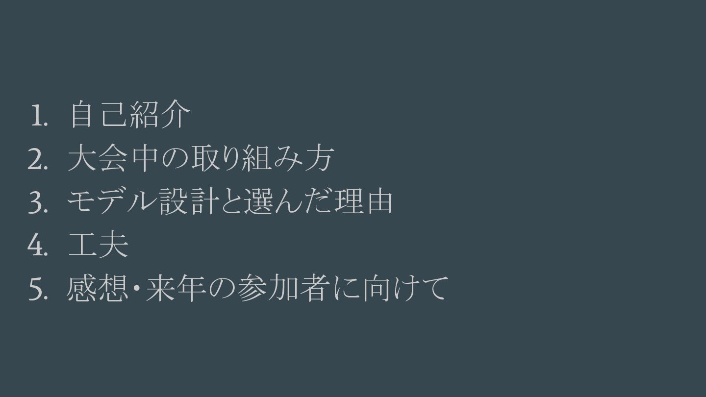 1. 自己紹介 2. 大会中の取り組み方 3. モデル設計と選んだ理由 4. 工夫 5. 感想・来年の参加者に向けて