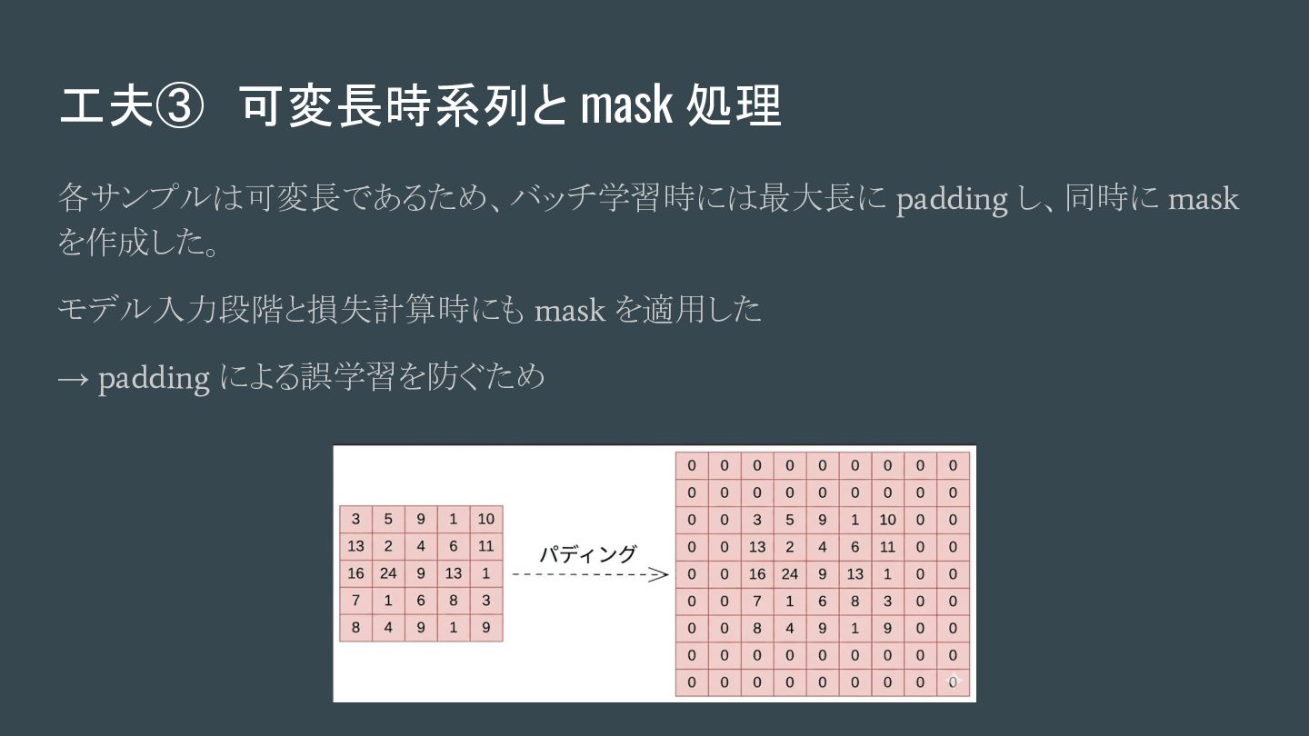工夫③ 可変長時系列と mask 処理 各サンプルは可変長であるため、バッチ学習時には最大長に padding し、同時に mask を作成した。 モデル入力段階と損失計算時にも mask