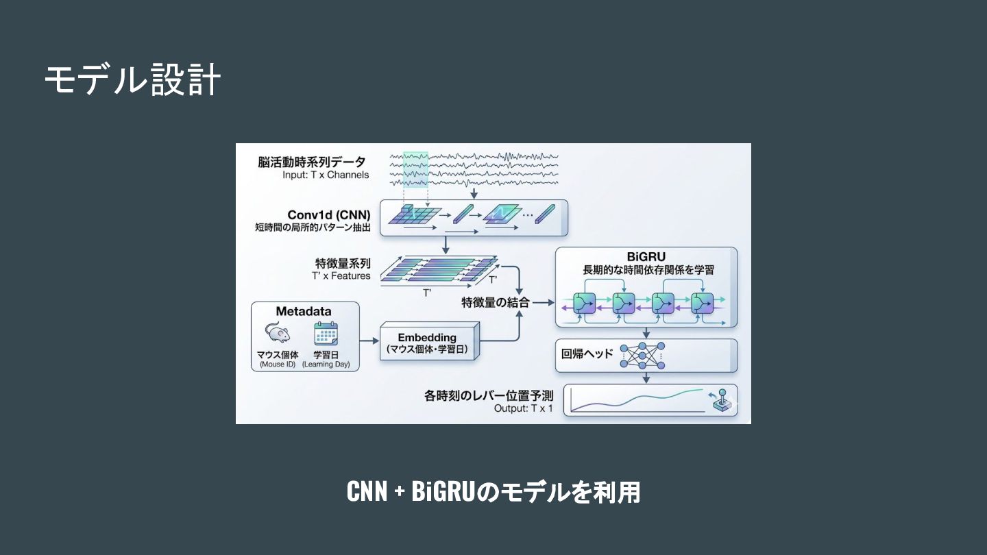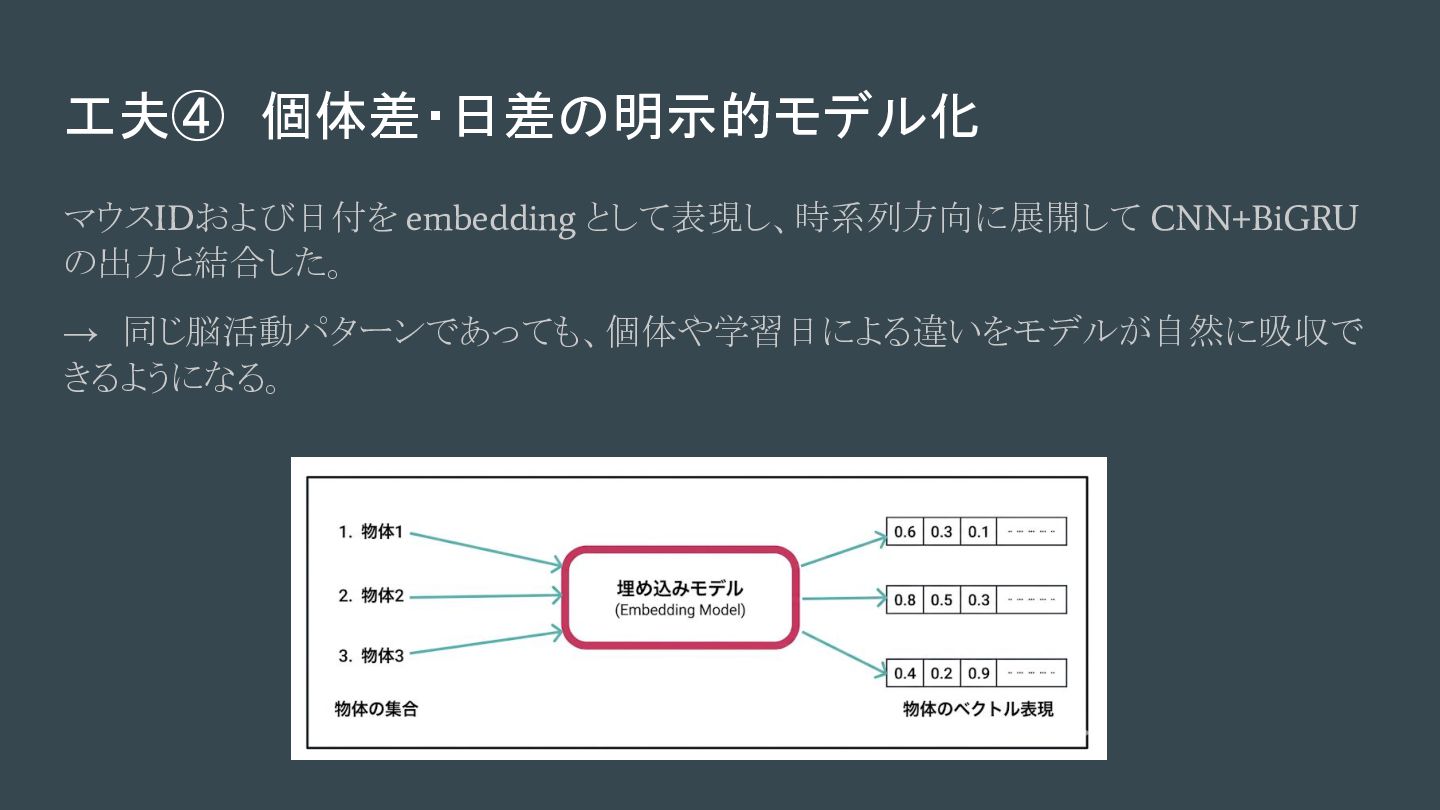 工夫④ 個体差・日差の明示的モデル化 マウスIDおよび日付を embedding として表現し、時系列方向に展開して CNN+BiGRU の出力と結合した。 → 同じ脳活動パターンであっても、個体や学習日による違いをモデルが自然に吸収で きるようになる。