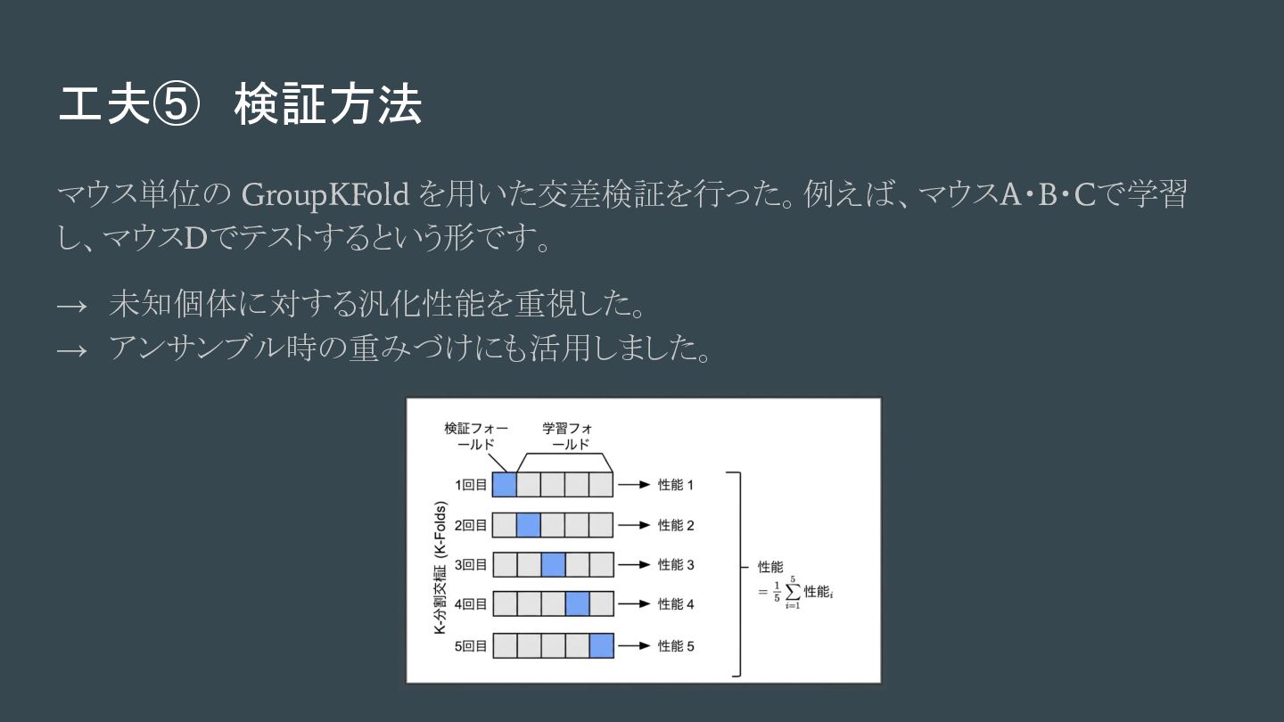 工夫⑤ 検証方法 マウス単位の GroupKFold を用いた交差検証を行った。例えば、マウスA・B・Cで学習 し、マウスDでテストするという形です。 → 未知個体に対する汎化性能を重視した。 → アンサンブル時の重みづけにも活用しました。