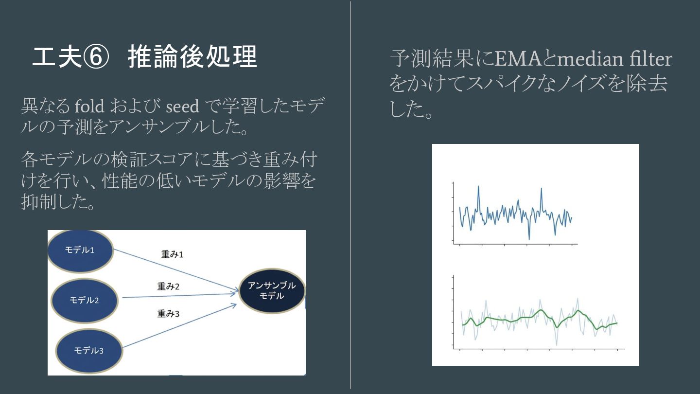 工夫⑥ 推論後処理 異なる fold および seed で学習したモデ ルの予測をアンサンブルした。 各モデルの検証スコアに基づき重み付 けを行い、性能の低いモデルの影響を 抑制した。