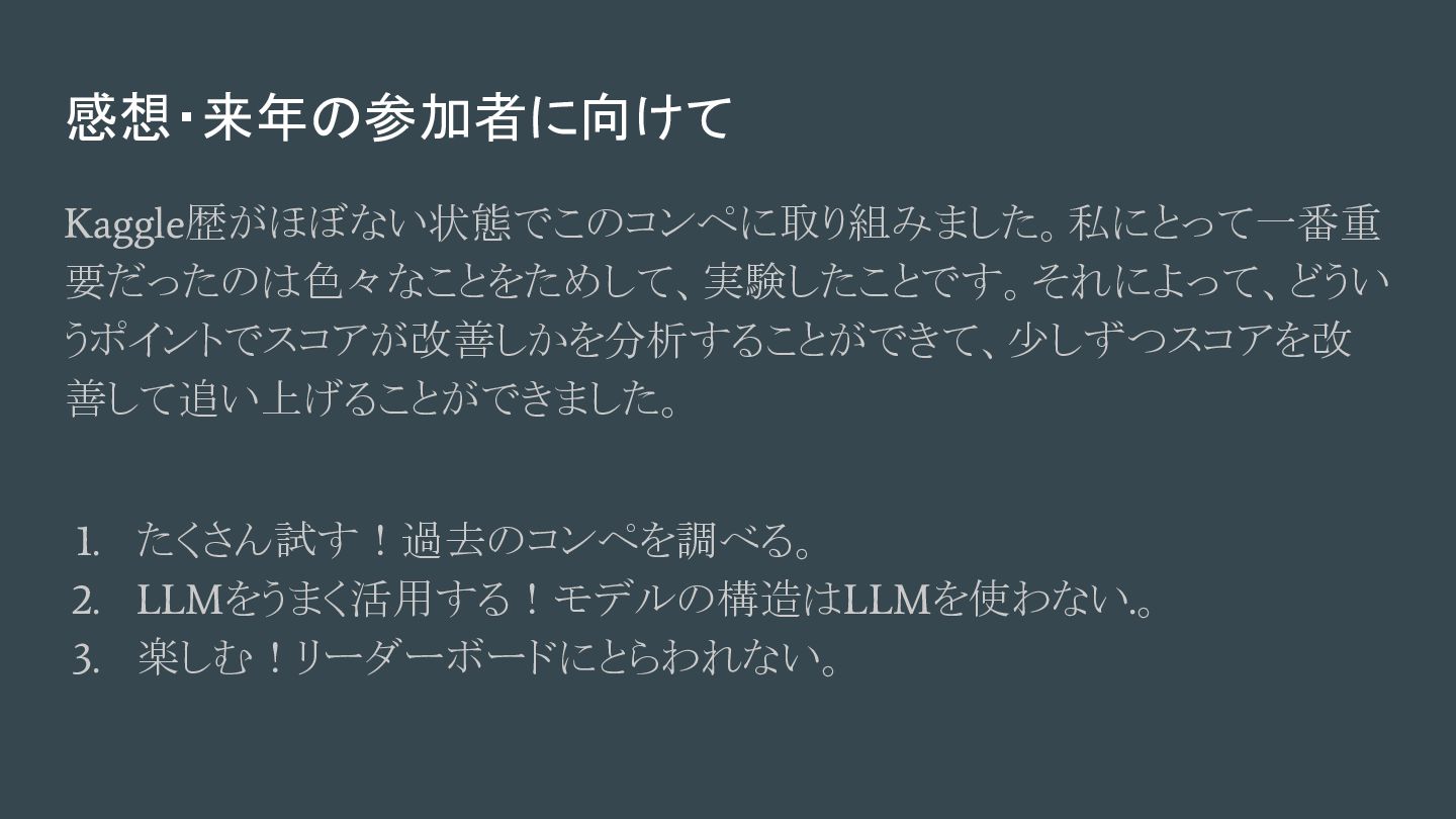 感想・来年の参加者に向けて Kaggle歴がほぼない状態でこのコンペに取り組みました。私にとって一番重 要だったのは色々なことをためして、実験したことです。それによって、どうい うポイントでスコアが改善しかを分析することができて、少しずつスコアを改 善して追い上げることができました。 1. たくさん試す!過去のコンペを調べる。 2. LLMをうまく活用する!モデルの構造はLLMを使わない.。 3.