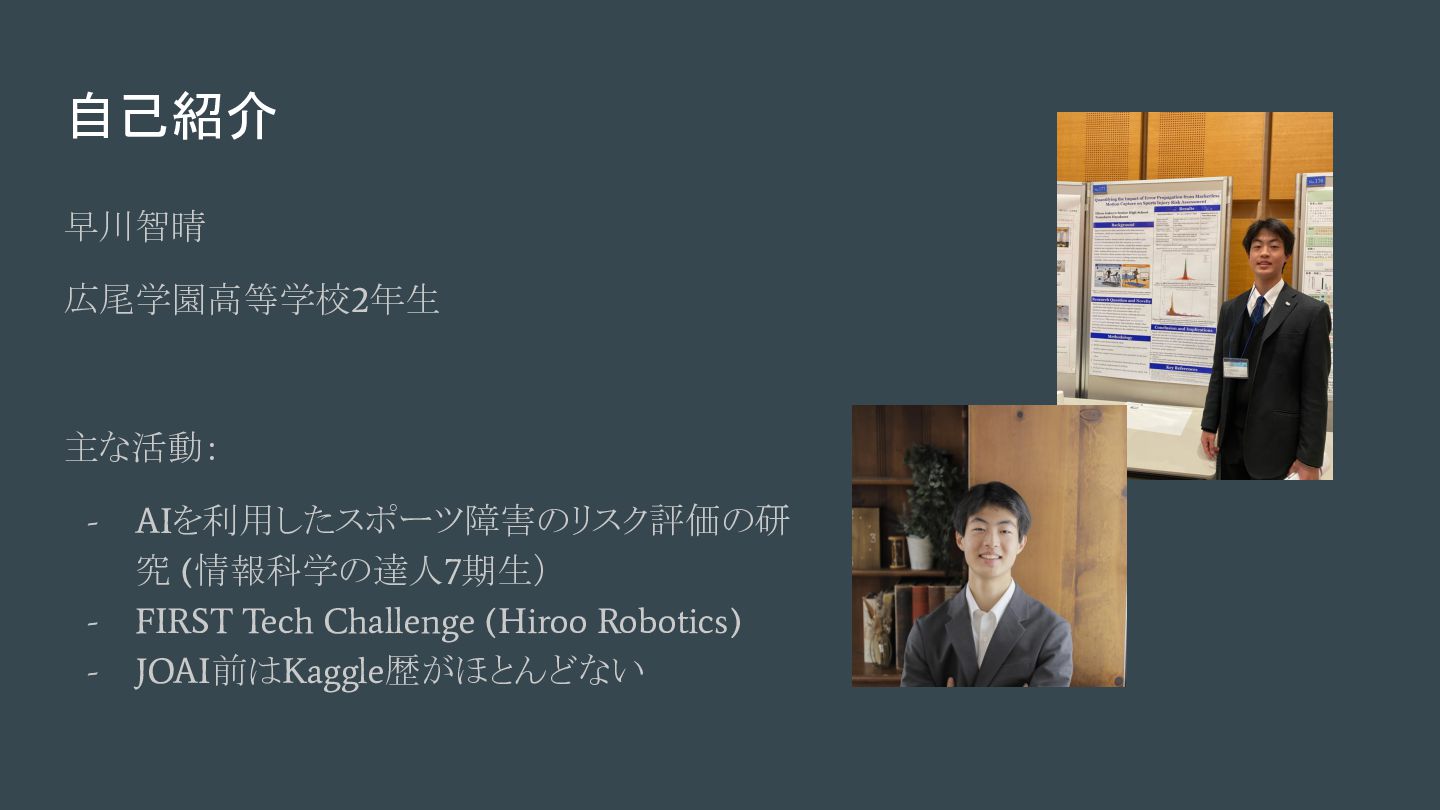自己紹介 早川智晴 広尾学園高等学校2年生 主な活動: - AIを利用したスポーツ障害のリスク評価の研 究 (情報科学の達人7期生) - FIRST