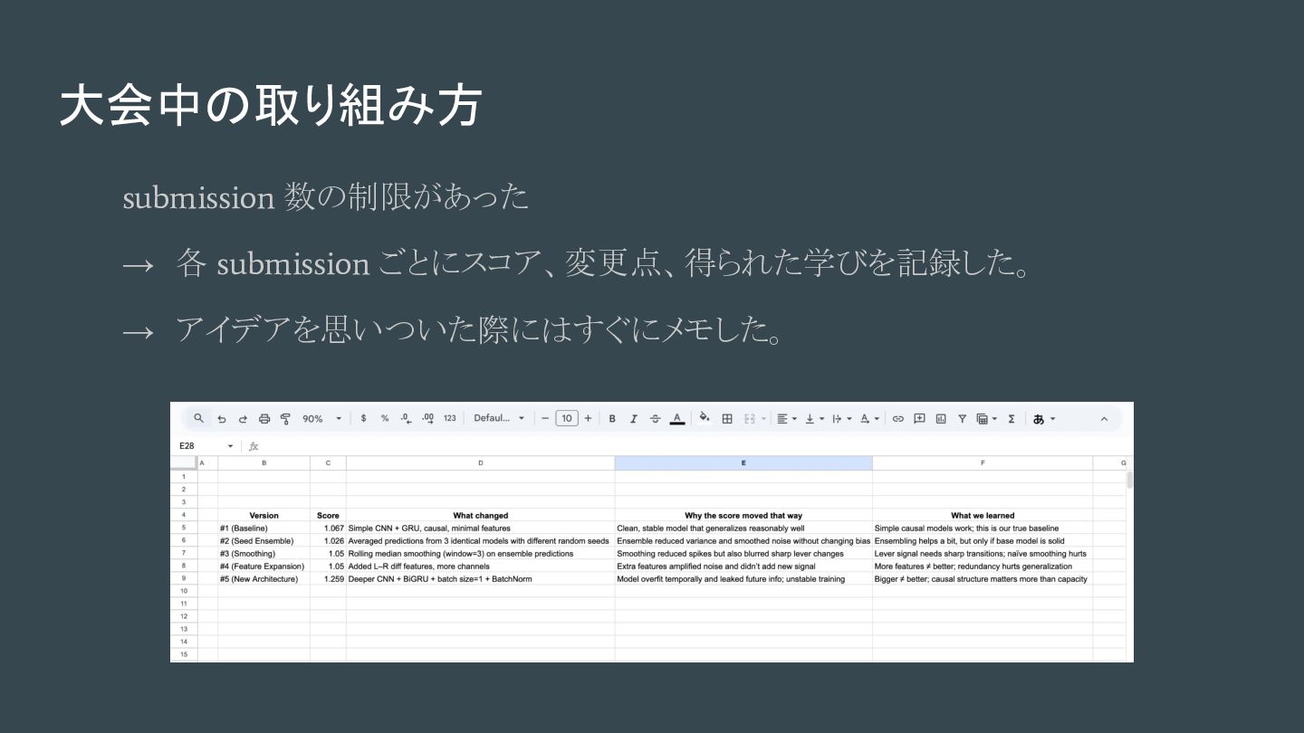 大会中の取り組み方 submission 数の制限があった → 各 submission ごとにスコア、変更点、得られた学びを記録した。 → アイデアを思いついた際にはすぐにメモした。