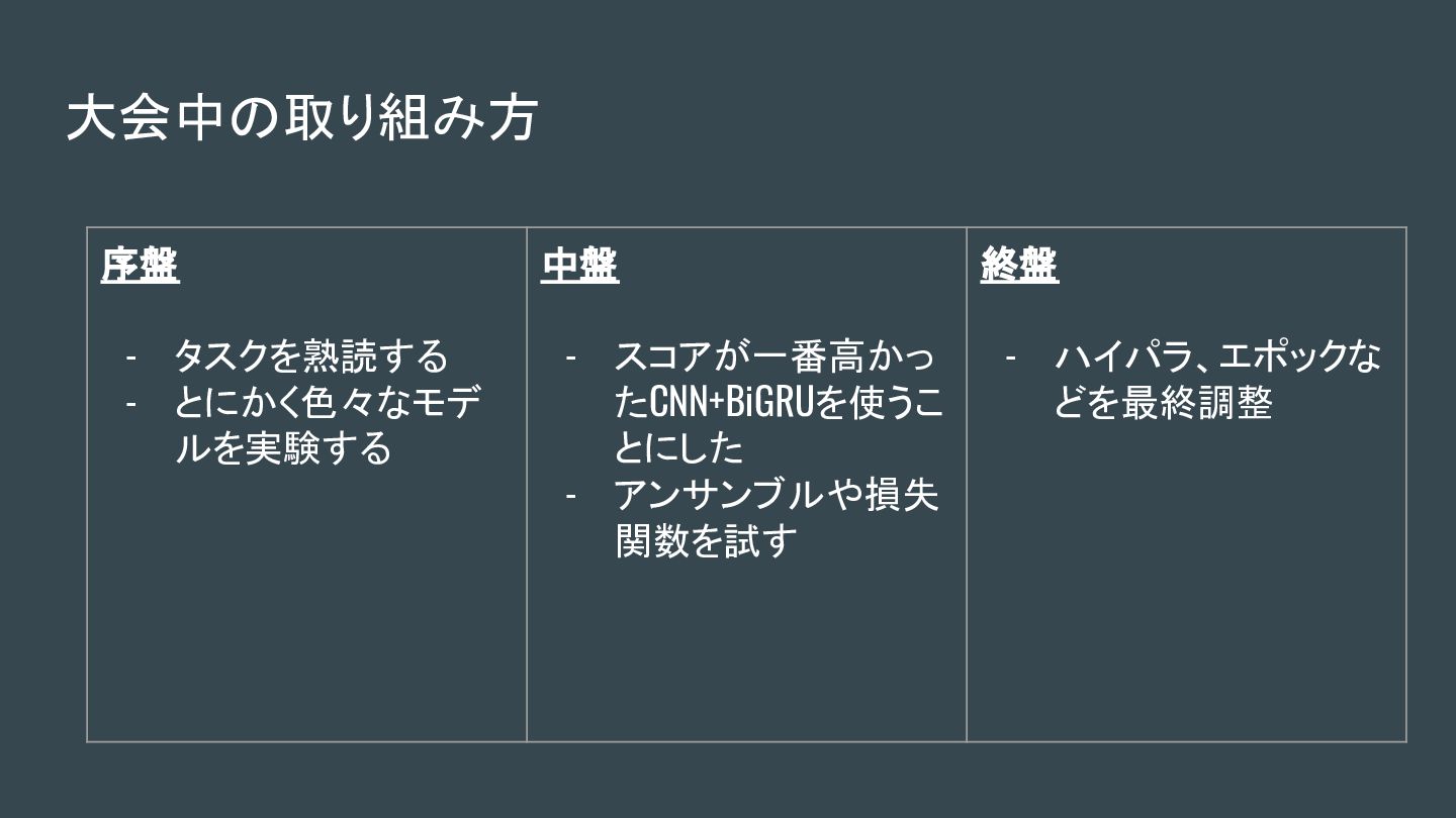 たCNN+BiGRUを使うこ とにした - アンサンブルや損失 関数を試す 終盤 - ハイパラ、エポックな どを最終調整