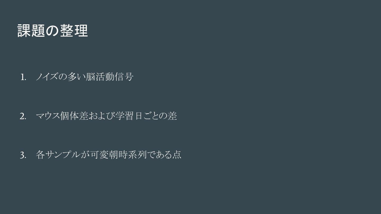 課題の整理 1. ノイズの多い脳活動信号 2. マウス個体差および学習日ごとの差 3. 各サンプルが可変朝時系列である点