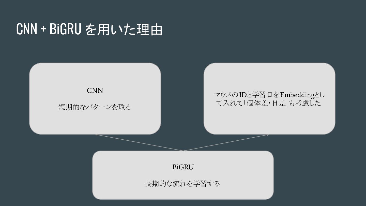 CNN + BiGRU を用いた理由 CNN 短期的なパターンを取る マウスのIDと学習日をEmbeddingとし て入れて「個体差・日差」も考慮した BiGRU 長期的な流れを学習する