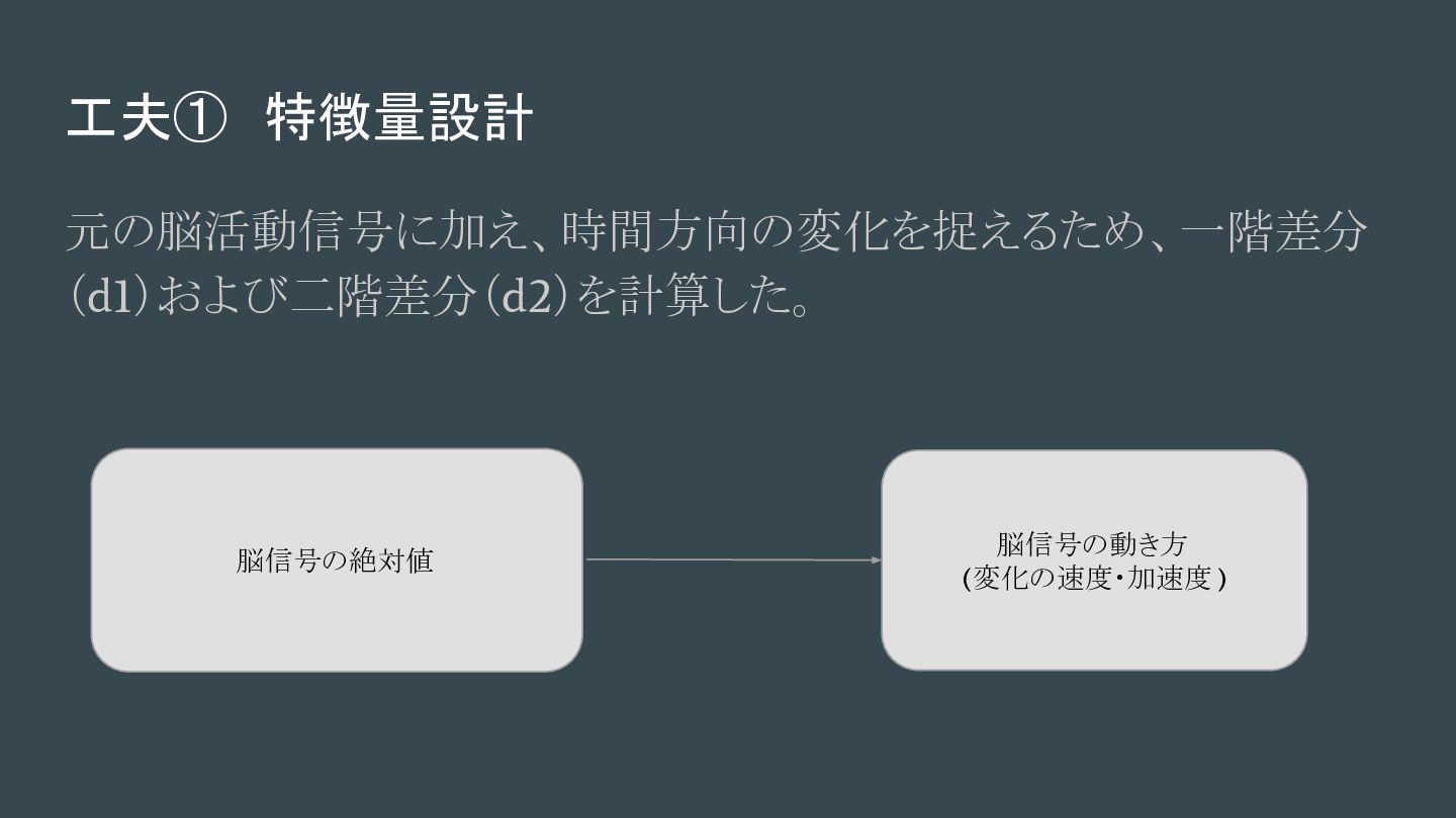 工夫① 特徴量設計 元の脳活動信号に加え、時間方向の変化を捉えるため、一階差分 (d1)および二階差分(d2)を計算した。 脳信号の絶対値 脳信号の動き方 (変化の速度・加速度 )