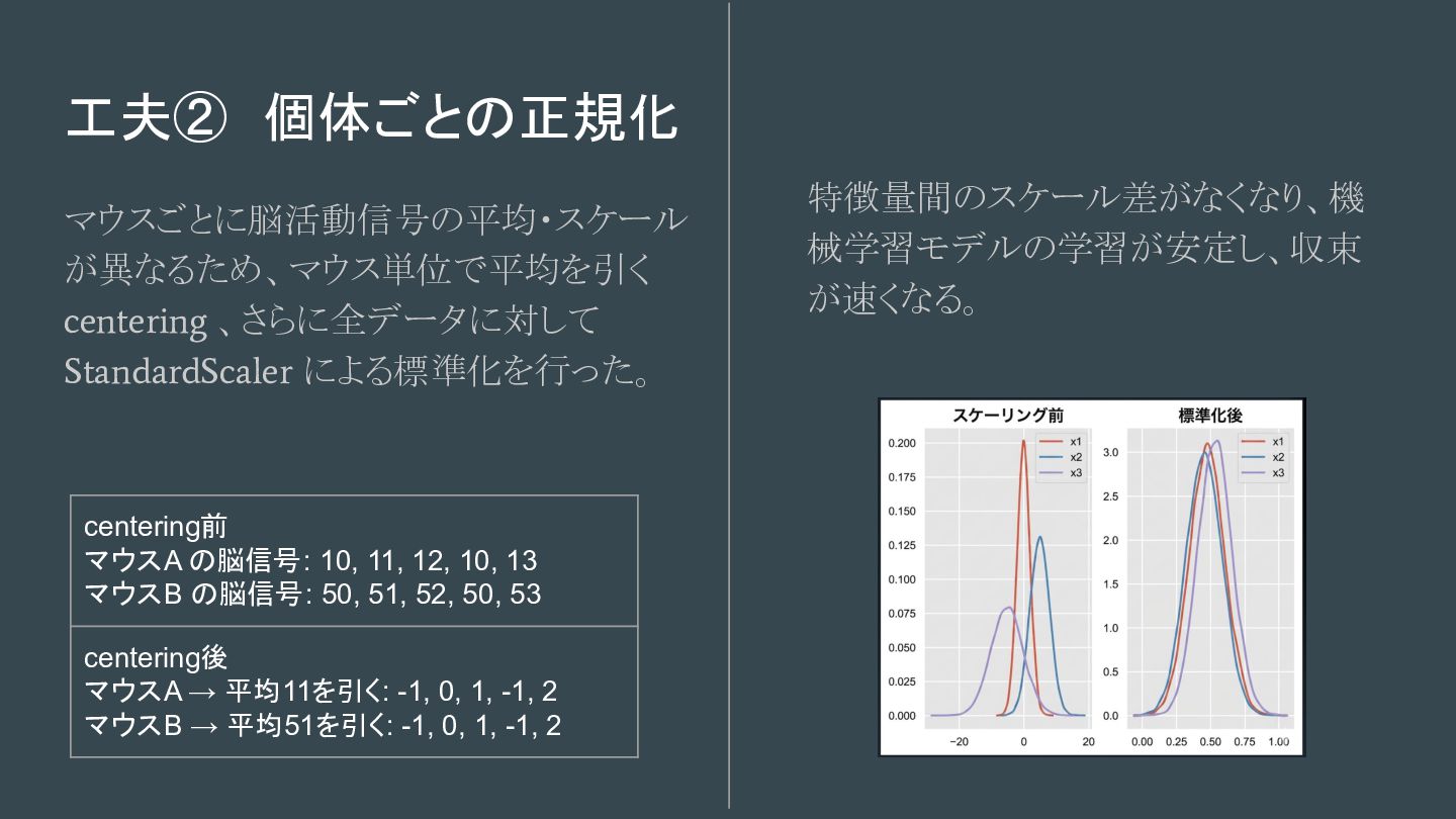 工夫② 個体ごとの正規化 マウスごとに脳活動信号の平均・スケール が異なるため、マウス単位で平均を引く centering 、さらに全データに対して StandardScaler による標準化を行った。 特徴量間のスケール差がなくなり、機 械学習モデルの学習が安定し、収束 が速くなる。