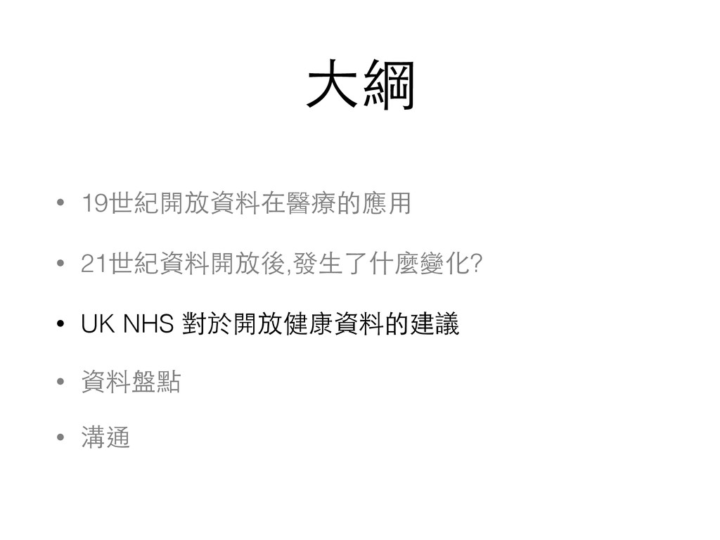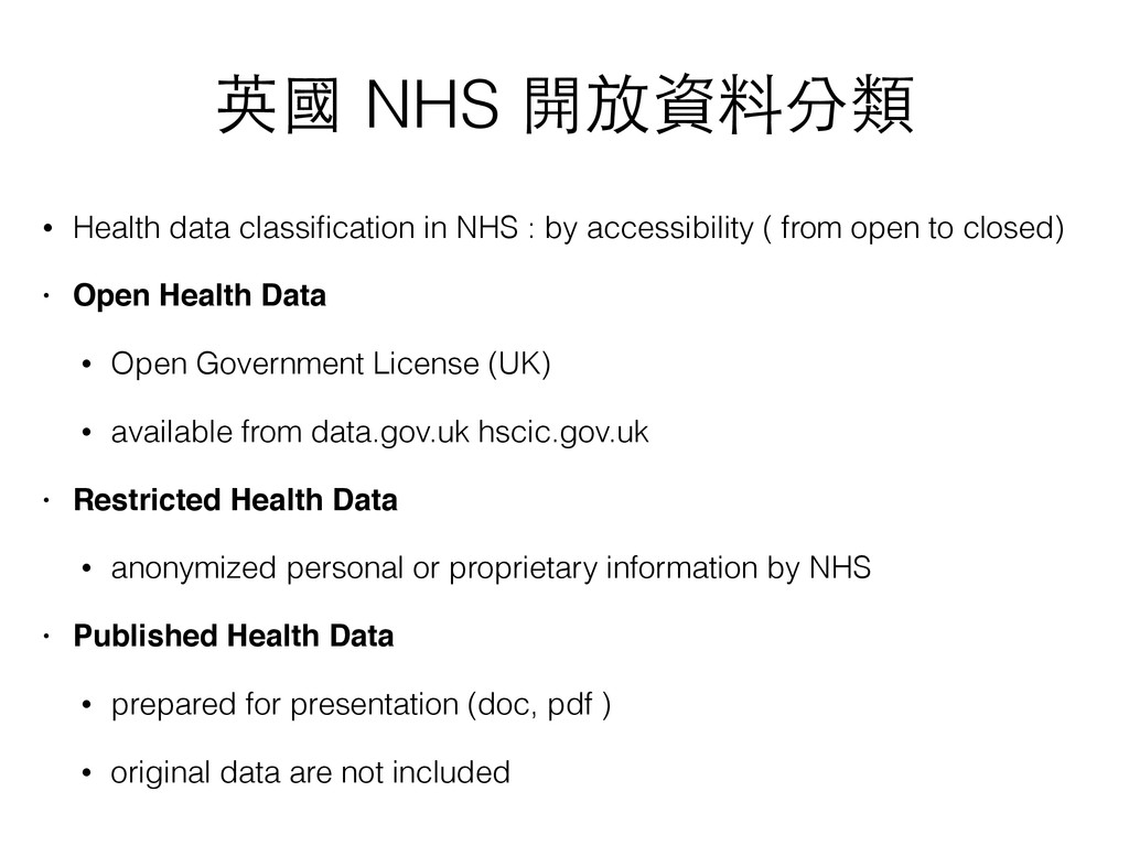 by accessibility ( from open to closed) • Open Health Data • Open Government License (UK) • available from data.gov.uk hscic.gov.uk • Restricted Health Data • anonymized personal or proprietary information by NHS • Published Health Data • prepared for presentation (doc, pdf ) • original data are not included