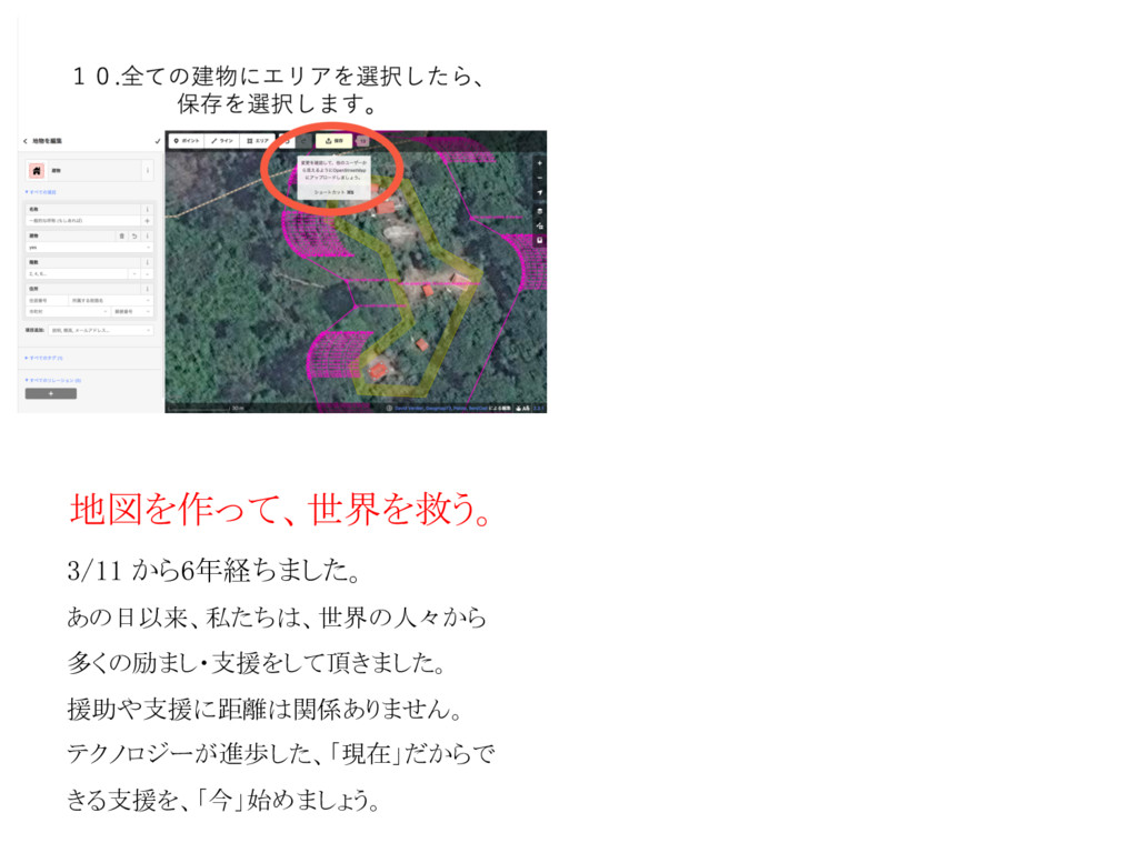 3/11 から6年経ちました。 あの日以来、私たちは、世界の人々から 多くの励まし・支援をして頂きました。 援助や支援に距離は関係ありません。 テクノロジーが進歩した、「現在」だからで きる支援を、「今」始めましょう。 地図を作って、世界を救う。