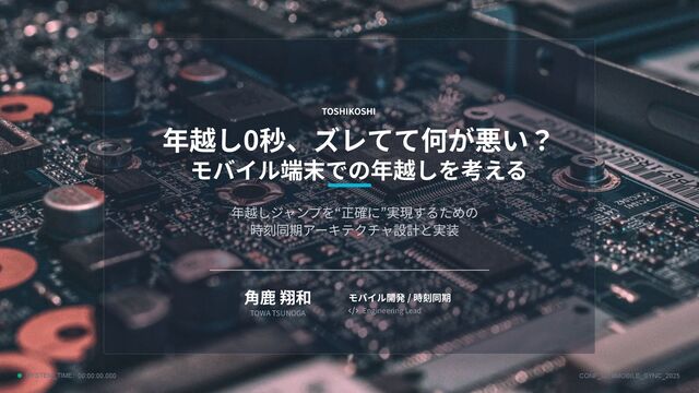 TOSHIKOSHI Engineering Lead 年越し0秒、ズレてて何が悪い? モバイル端末での年越しを考える 年越しジャンプを“正確に”実現するための 時刻同期アーキテクチャ設計と実装 ⾓⿅ 翔和 TOWA