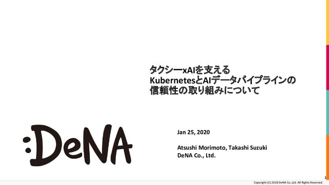 2018 DeNA Co.,Ltd. All Rights Reserved. タクシーxAIを支える KubernetesとAIデータパイプラインの 信頼性の取り組みについて Jan 25, 2020 Atsushi Morimoto, Takashi Suzuki DeNA Co., Ltd. 1
