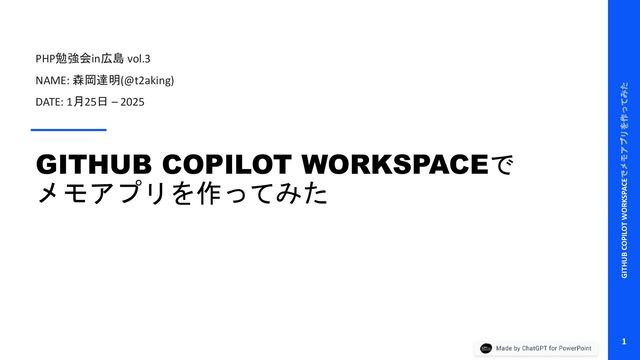 GITHUB COPILOT WORKSPACEで メモアプリを作ってみた GITHUB COPILOT WORKSPACEでメモアプリを作ってみた PHP勉強会in広島 vol.3 NAME: