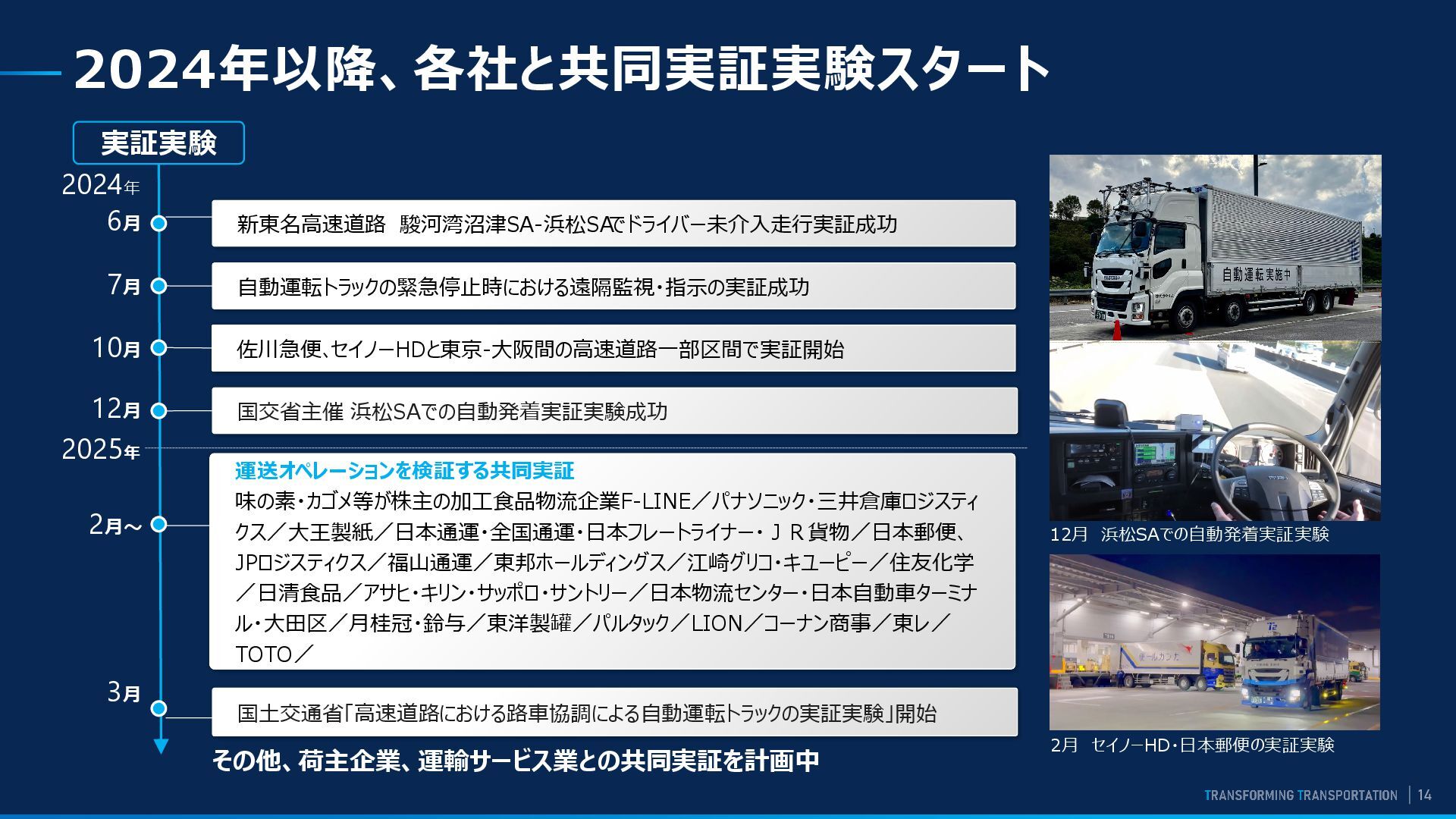 9. 14 6月 2024年 7月 2025年 その他、荷主企業、運輸サービス業との共同実証を計画中 10月 実証実験 国土交通省「高速道路における路車協調による自動運転トラックの実証実験」開始 新東名高速道路