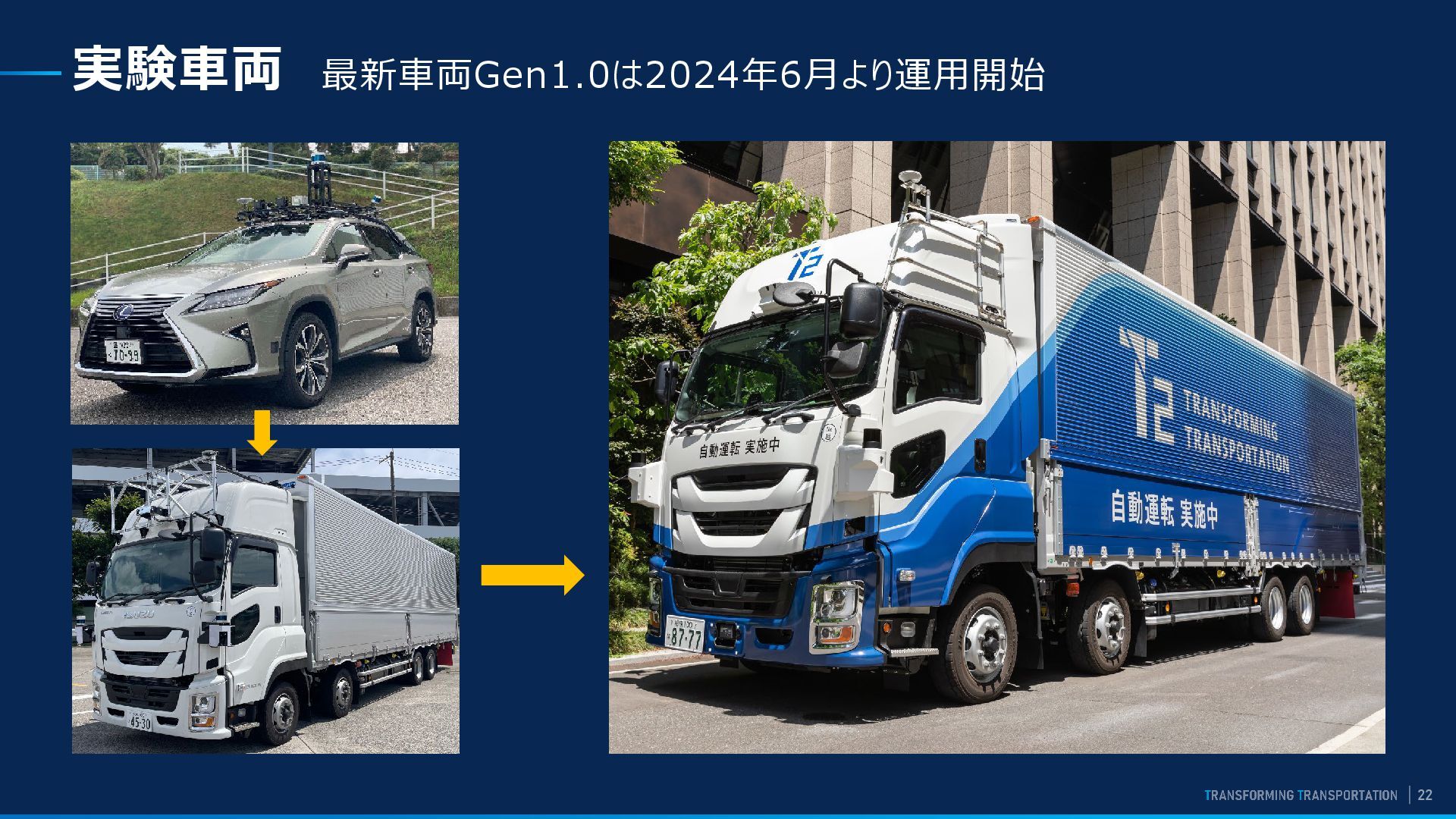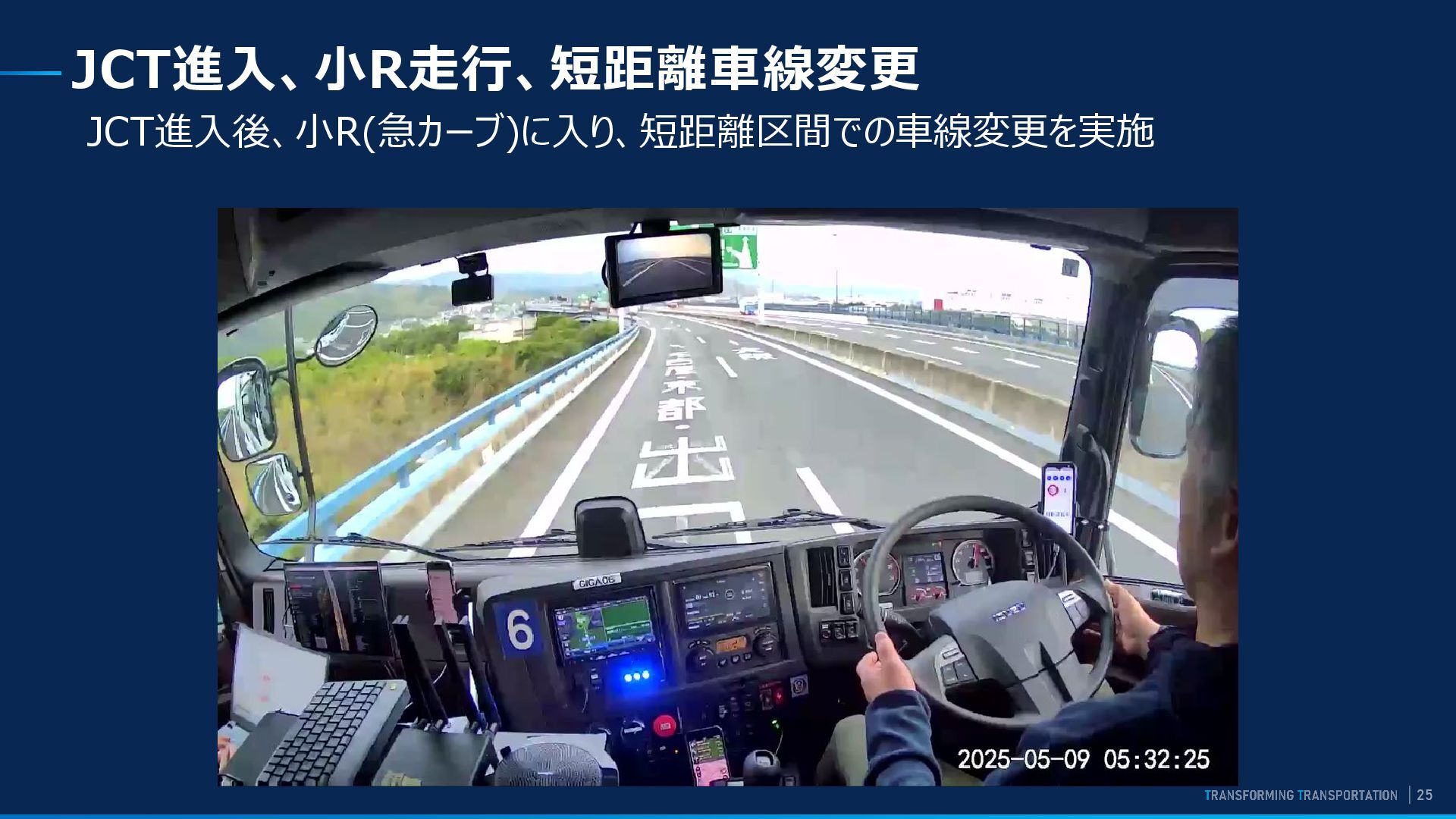 = 自動走行距離÷(ODD内手動運転+自動走行距離)×100 自動運転走行率:99.7% (綾瀬SIC – 魚崎IC) 魚崎IC 予定 場所・区間 ハイライト 24年 10月末 沼津SAー浜松SA 長距離トンネル走行、カットイン/カットアウト対応、積載量30% 11月末 沼津SAー豊田東JCT 積載量50% 12月末 沼津SAー豊田東JCT 夜間走行、50%積載の有償貨物、新型車両立ち上げ 25年 1月末 御殿場ICー西宮IC(本線料金所前) 積載100%の有償貨物、補助ブレーキ導入 2月末 御殿場ICー西宮IC(本線料金所前) 渋滞対応、新型車両複数台立ち上げ 3月末 横浜青葉JCTー西宮IC(本線料金所前) ドライバトリガ車線変更、霧・雨天時の認識性能向上、JCT走行、HMI導入 4月末 横浜青葉JCTー西宮IC(本線料金所前) 自動車線変更、システム安定性向上 5月末 横浜青葉JCTー魚崎IC(本線料金所前) 自動キャリブレーションチェック導入 自動運転走行距離の延伸、積載量の増加、 各種機能の検証 技術開発進捗