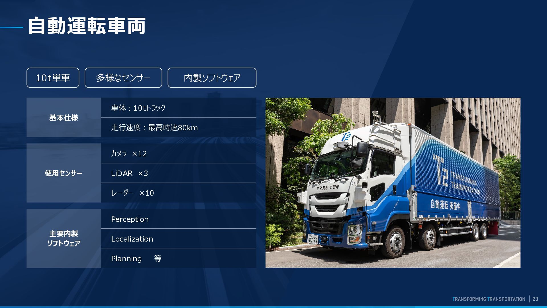 LiDAR ×3 レーダー ×10 主要内製 ソフトウェア 使用センサー 基本仕様 10t単車 多様なセンサー 内製ソフトウェア 23