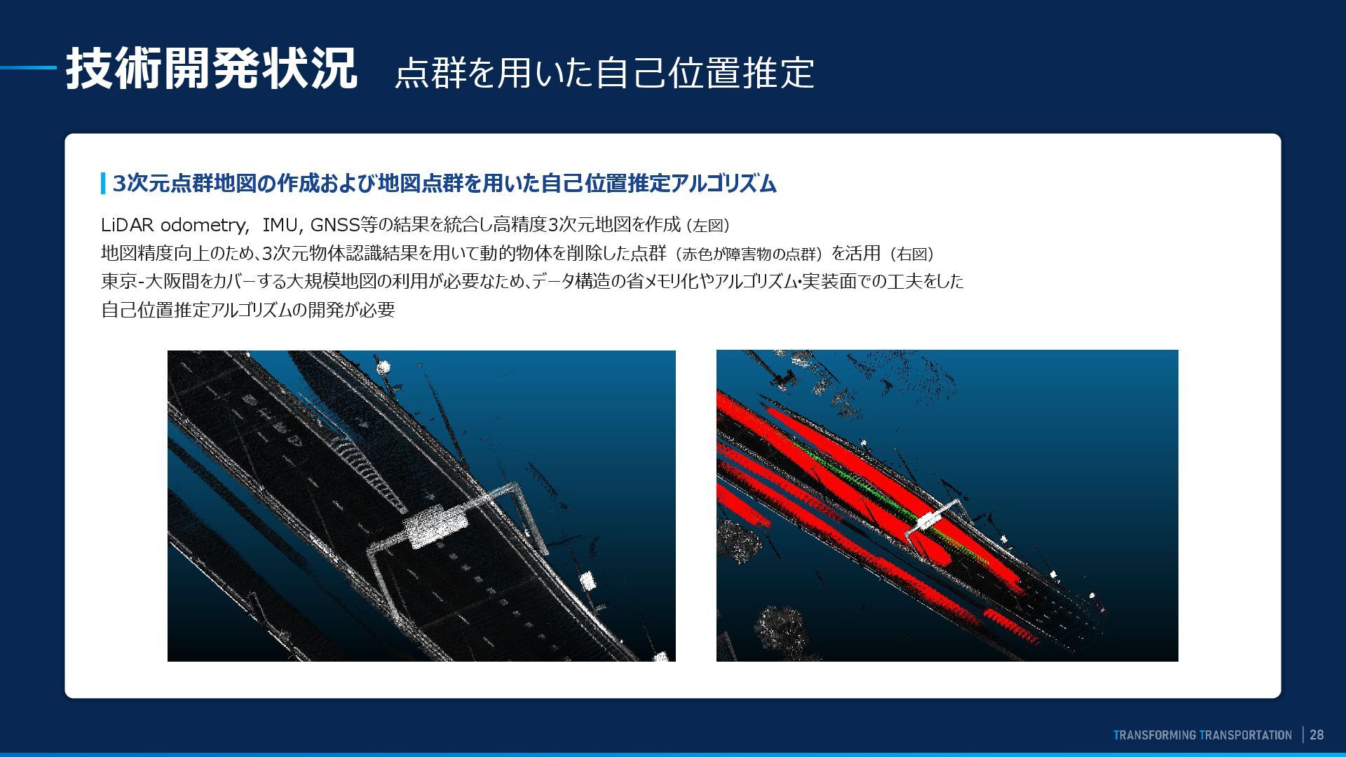 (衛星測位システム) ・ 点群・IMU:Inertial Measurement Unit (慣性計測装置) ・ 車速・白線・標識を統合して自己位置推定を行うアルゴリズムを開発中。 自己位置推定アルゴリズム 技術開発状況 認識・自己位置推定