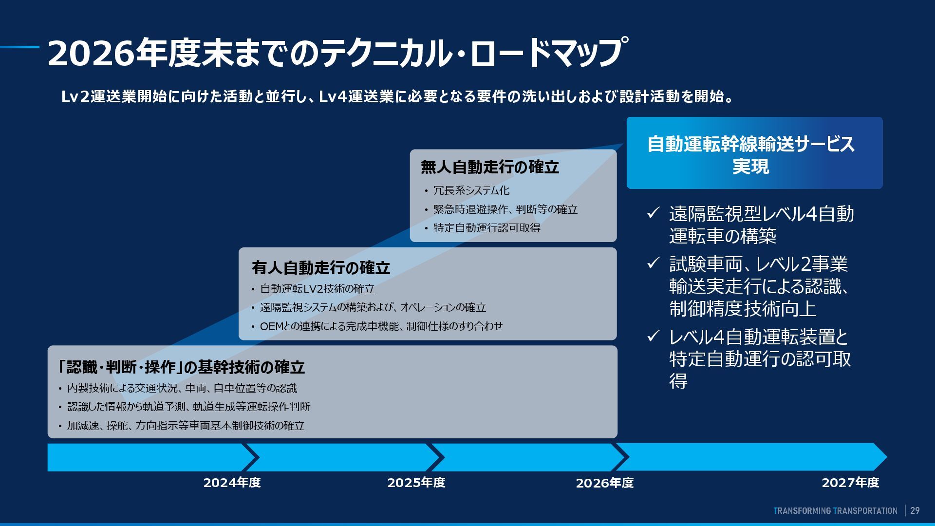 • 緊急時退避操作、判断等の確立 • 特定自動運行認可取得 • 自動運転LV2技術の確立 • 遠隔監視システムの構築および、オペレーションの確立 • OEMとの連携による完成車機能、制御仕様のすり合わせ • 内製技術による交通状況、車両、自車位置等の認識 • 認識した情報から軌道予測、軌道生成等運転操作判断 • 加減速、操舵、方向指示等車両基本制御技術の確立 2026年度末までのテクニカル・ロードマップ 2027年度 自動運転幹線輸送サービス 実現  遠隔監視型レベル4自動 運転車の構築  試験車両、レベル2事業 輸送実走行による認識、 制御精度技術向上  レベル4自動運転装置と 特定自動運行の認可取 得