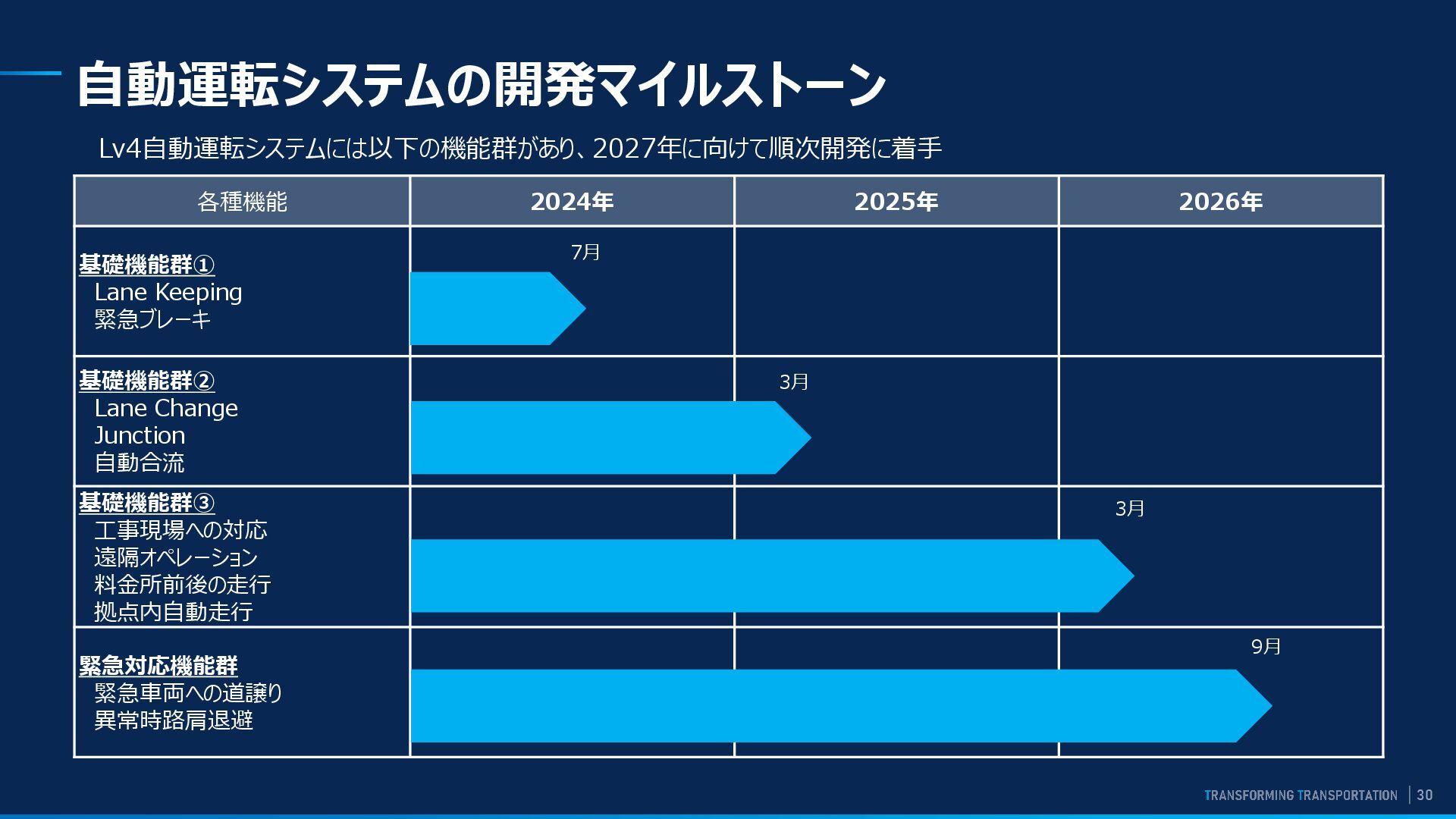 Lane Change Junction 自動合流 基礎機能群③ 工事現場への対応 遠隔オペレーション 料金所前後の走行 拠点内自動走行 緊急対応機能群 緊急車両への道譲り 異常時路肩退避 Lv4自動運転システムには以下の機能群があり、2027年に向けて順次開発に着手 7月 3月 3月 9月 自動運転システムの開発マイルストーン