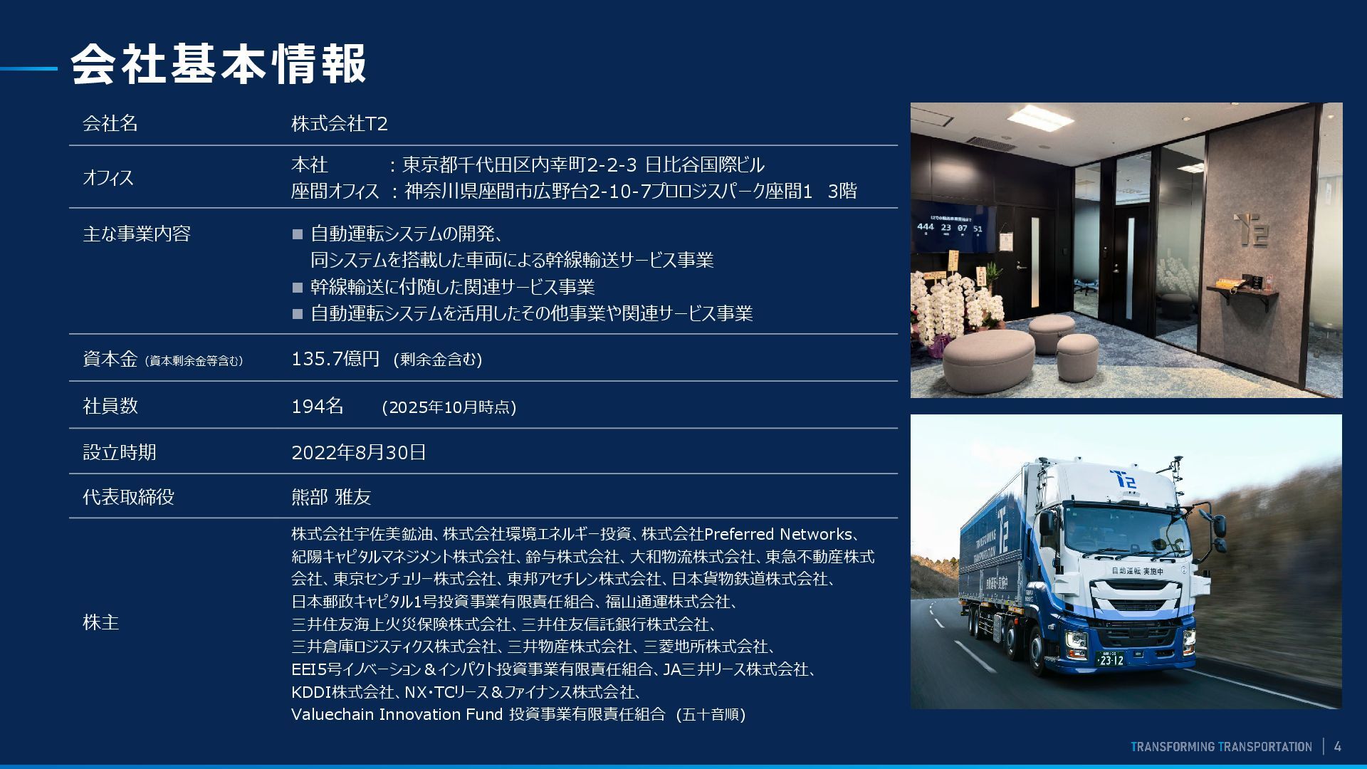 3階 主な事業内容  自動運転システムの開発、 同システムを搭載した車両による幹線輸送サービス事業  幹線輸送に付随した関連サービス事業  自動運転システムを活用したその他事業や関連サービス事業 資本金(資本剰余金等含む) 135.7億円 (剰余金含む) 社員数 194名 (2025年10月時点) 設立時期 2022年8月30日 代表取締役 熊部 雅友 株主 株式会社宇佐美鉱油、株式会社環境エネルギー投資、株式会社Preferred Networks、 紀陽キャピタルマネジメント株式会社、鈴与株式会社、大和物流株式会社、東急不動産株式 会社、東京センチュリー株式会社、東邦アセチレン株式会社、日本貨物鉄道株式会社、 日本郵政キャピタル1号投資事業有限責任組合、福山通運株式会社、 三井住友海上火災保険株式会社、三井住友信託銀行株式会社、 三井倉庫ロジスティクス株式会社、三井物産株式会社、三菱地所株式会社、 EEI5号イノベーション&インパクト投資事業有限責任組合、JA三井リース株式会社、 KDDI株式会社、NX・TCリース&ファイナンス株式会社、 Valuechain Innovation Fund 投資事業有限責任組合 (五十音順)
