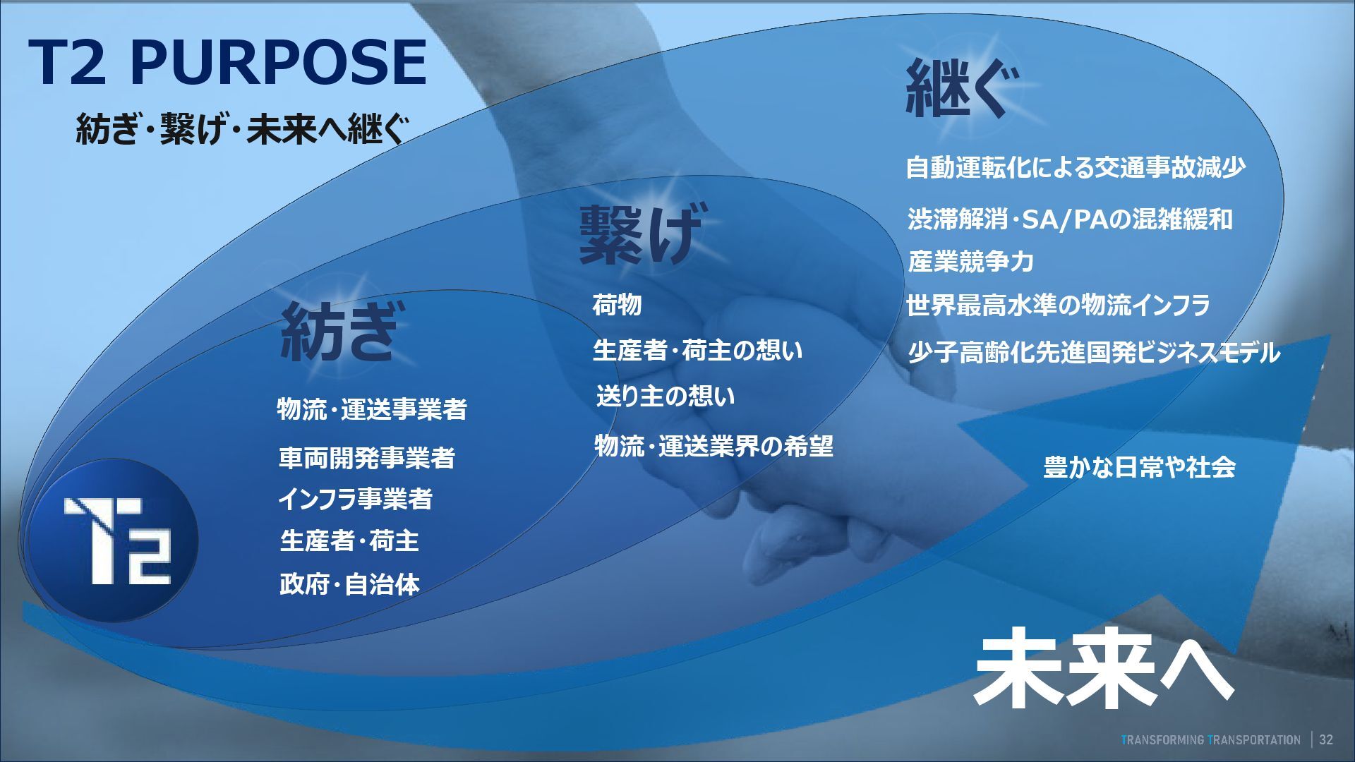 豊かな日常や社会 産業競争力 少子高齢化先進国発ビジネスモデル T2 PURPOSE 紡ぎ 自動運転化による交通事故減少 渋滞解消・SA/PAの混雑緩和 継ぐ 繫げ 紡ぎ・繋げ・未来へ継ぐ 物流・運送業界の希望 32