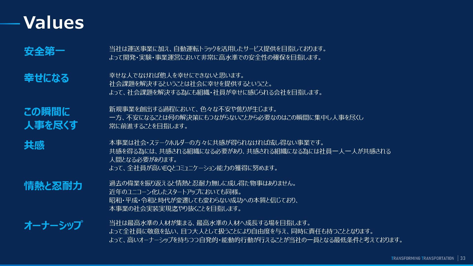 22. 33 当社は運送事業に加え、自動運転トラックを活用したサービス提供を目指しております。 よって開発・実験・事業運営において非常に高水準での安全性の確保を目指します。 安全第一 幸せな人でなければ他人を幸せにできないと思います。 社会課題を解決するということは社会に幸せを提供するということ。 よって、社会課題を解決する為にも組織・社員が幸せに感じられる会社を目指します。 幸せになる 新規事業を創出する過程において、色々な不安や焦りが生じます。 一方、不安になることは何の解決策にもつながらないことから必要なのはこの瞬間に集中し人事を尽くし