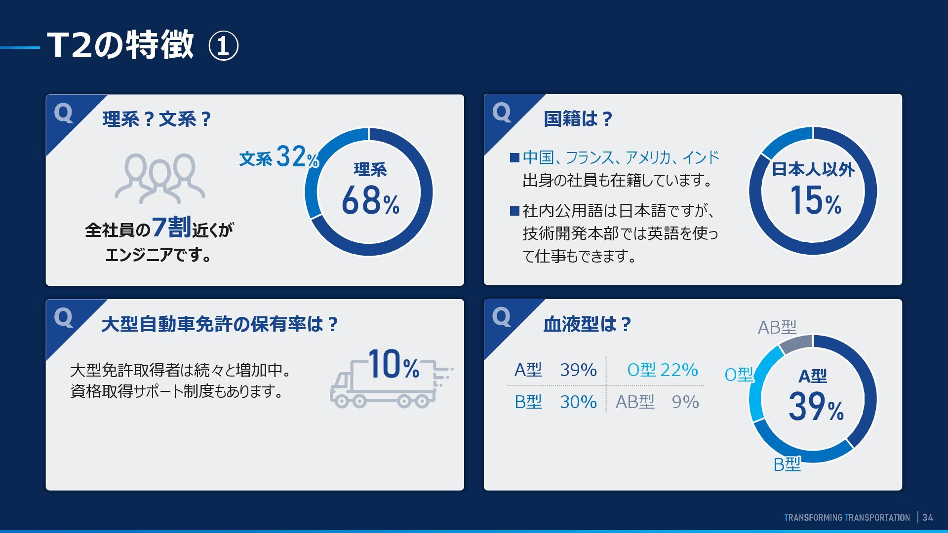 23. 34 T2の特徴 ① 理系?文系? 全社員の7割近くが エンジニアです。 国籍は? 中国、フランス、アメリカ、インド 出身の社員も在籍しています。 社内公用語は日本語ですが、