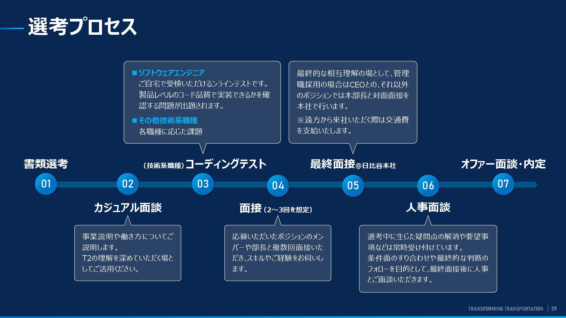 カジュアル面談 最終面接@日比谷本社 オファー面談・内定 書類選考 01 02 03 04 06 05 07 (技術系職種) コーディングテスト 応募いただいたポジションのメン バーや部長と複数回面接いた だき、 スキルやご経験をお伺いし ます。 事業説明や働き方についてご 説明します。 T2の理解を深めていただく場と してご活用ください。 最終的な相互理解の場として、 管理 職採用の場合はCEOとの、 それ以外 のポジションでは本部長と対面面接を 本社で行います。 ※遠方から来社いただく際は交通費 を支給いたします。 選考中に生じた疑問点の解消や要望事 項などは常時受け付けています。 条件面のすり合わせや最終的な判断の フォローを目的として、 最終面接後に人事 とご面談いただきます。 人事面談 選考プロセス