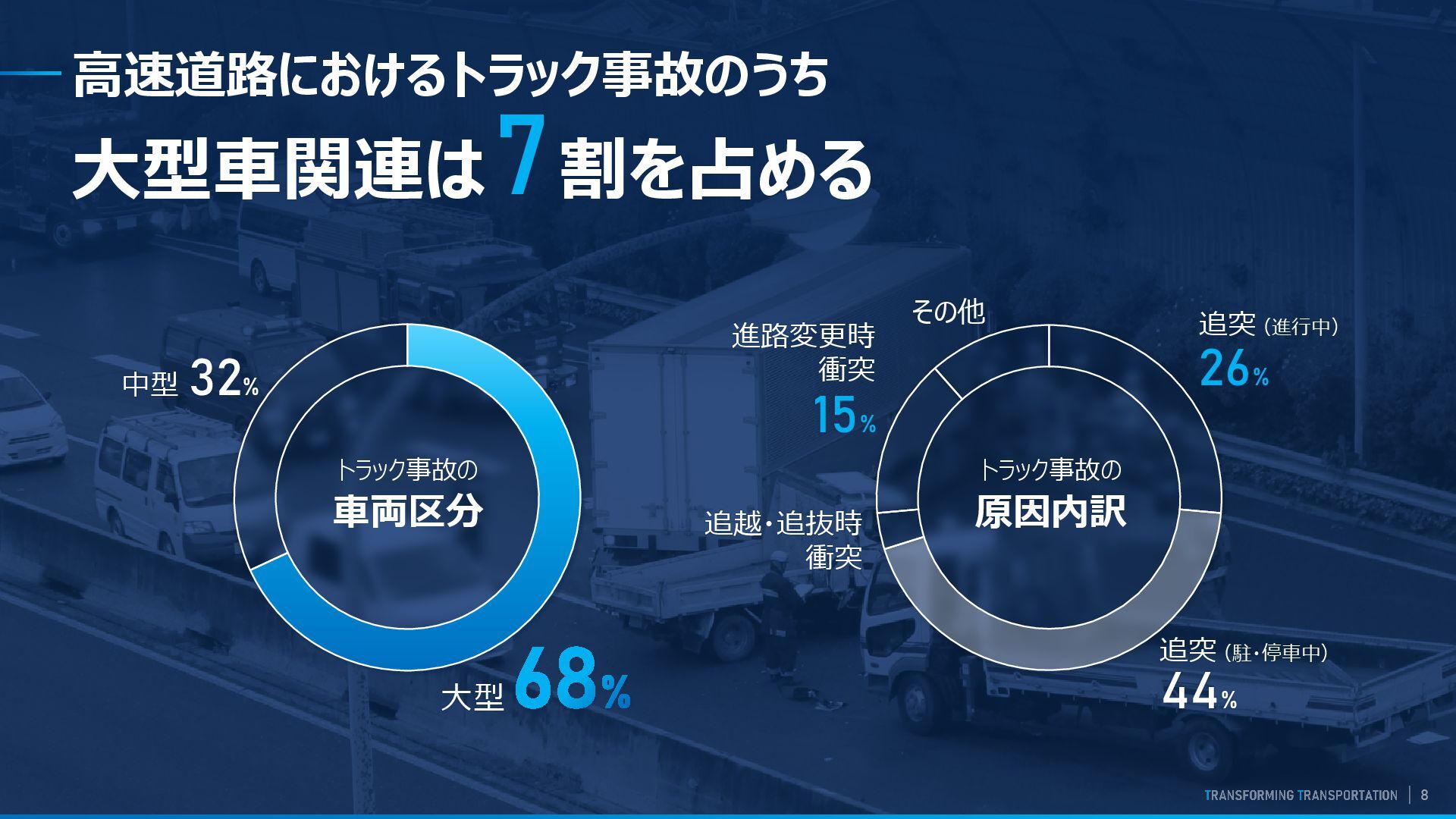 追突(進行中) 進路変更時 衝突 その他 追突(駐・停車中) 追越・追抜時 衝突 トラック事故の 原因内訳 15% 7 26% 44%