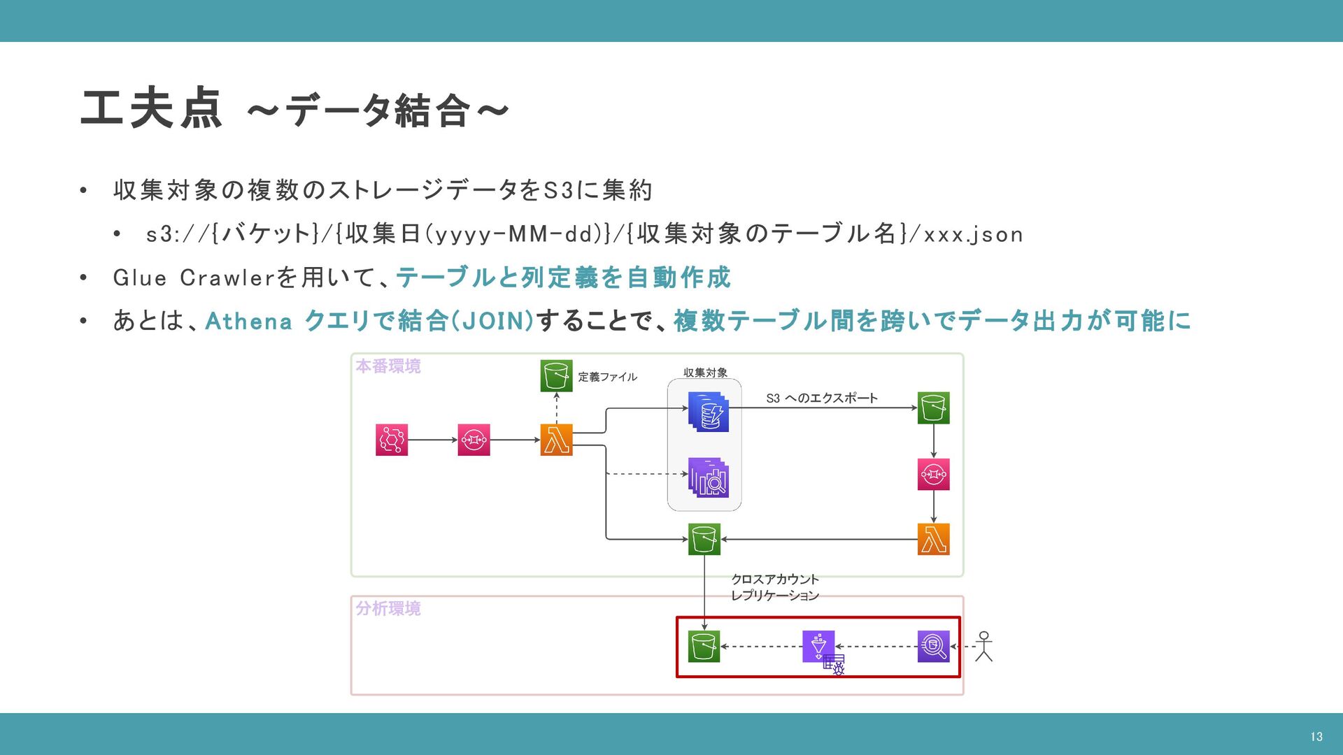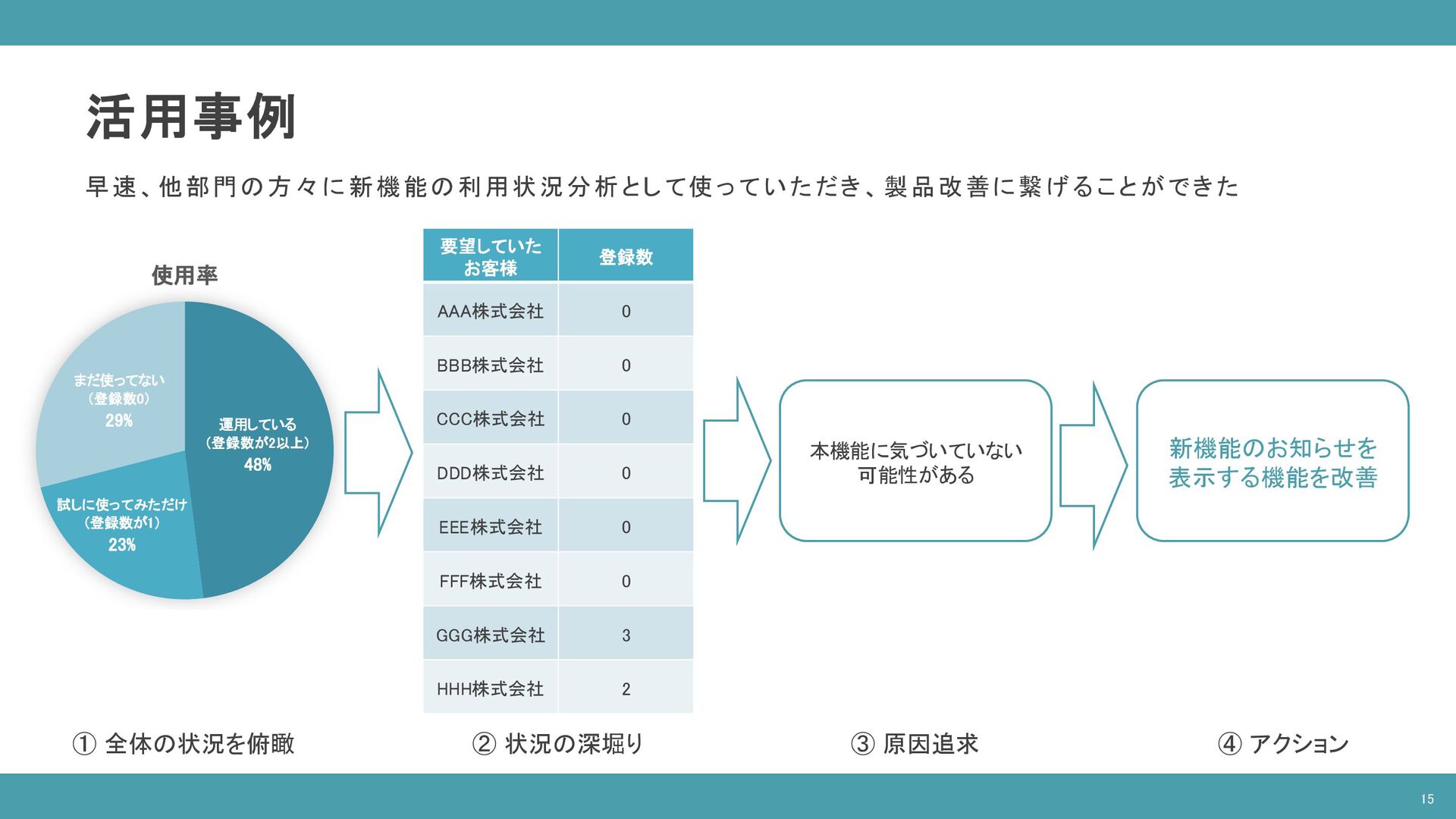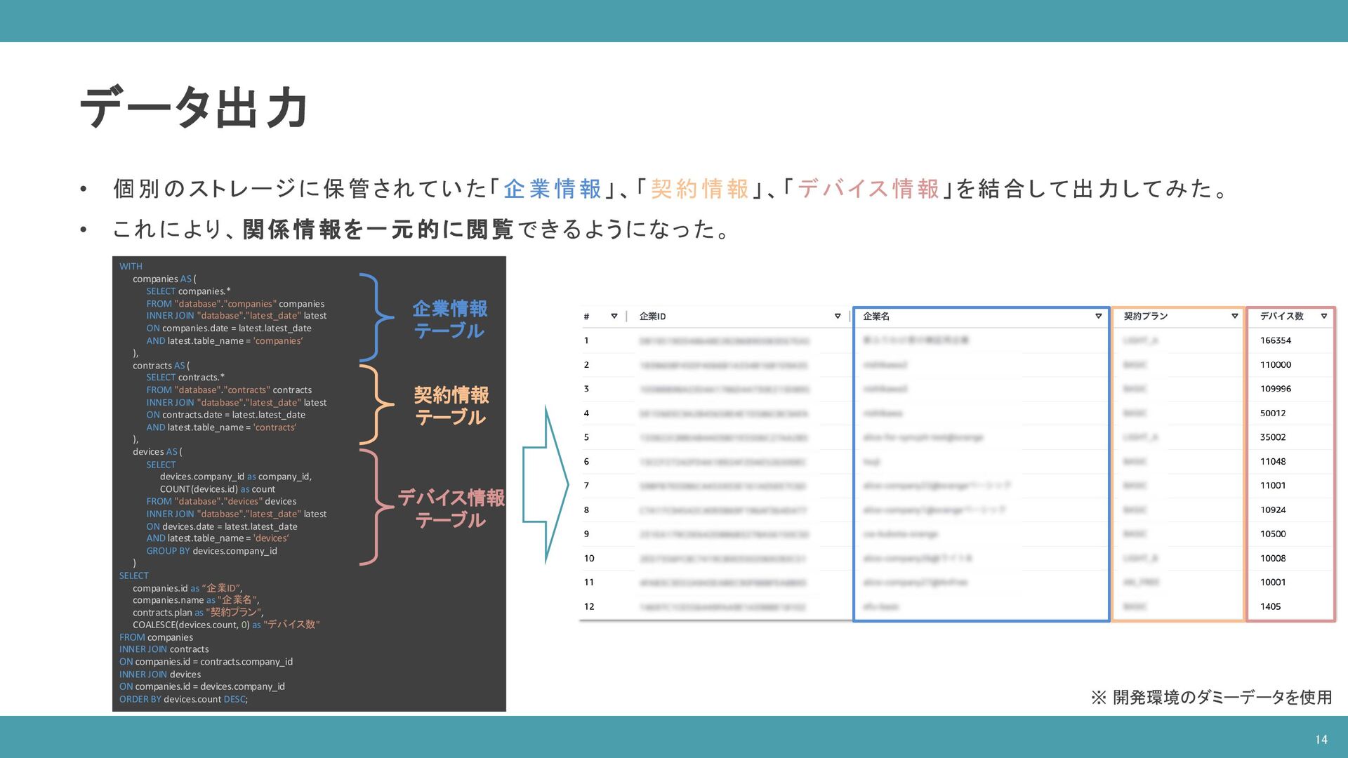 ( SELECT companies.* FROM "database"."companies" companies INNER JOIN "database"."latest_date" latest ON companies.date = latest.latest_date AND latest.table_name = 'companies‘ ), contracts AS ( SELECT contracts.* FROM "database"."contracts" contracts INNER JOIN "database"."latest_date" latest ON contracts.date = latest.latest_date AND latest.table_name = 'contracts‘ ), devices AS ( SELECT devices.company_id as company_id, COUNT(devices.id) as count FROM "database"."devices" devices INNER JOIN "database"."latest_date" latest ON devices.date = latest.latest_date AND latest.table_name = 'devices‘ GROUP BY devices.company_id ) SELECT companies.id as “企業ID”, companies.name as "企業名", contracts.plan as "契約プラン", COALESCE(devices.count, 0) as "デバイス数" FROM companies INNER JOIN contracts ON companies.id = contracts.company_id INNER JOIN devices ON companies.id = devices.company_id ORDER BY devices.count DESC; 企業情報 テーブル 契約情報 テーブル デバイス情報 テーブル ※ 開発環境のダミーデータを使用 14