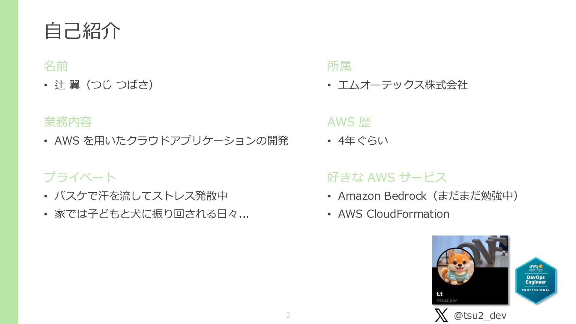 プライベート • バスケで汗を流してストレス発散中 • 家では子どもと犬に振り回される日々... 所属 • エムオーテックス株式会社 AWS 歴 • 4年ぐらい 好きな AWS サービス • Amazon Bedrock(まだまだ勉強中) • AWS CloudFormation @tsu2_dev 2