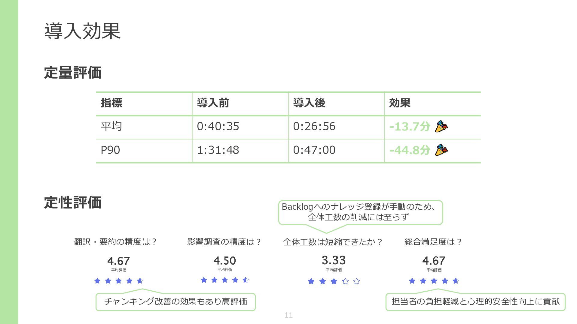 導入効果 定量評価 定性評価 指標 導入前 導入後 効果 平均 0:40:35 0:26:56