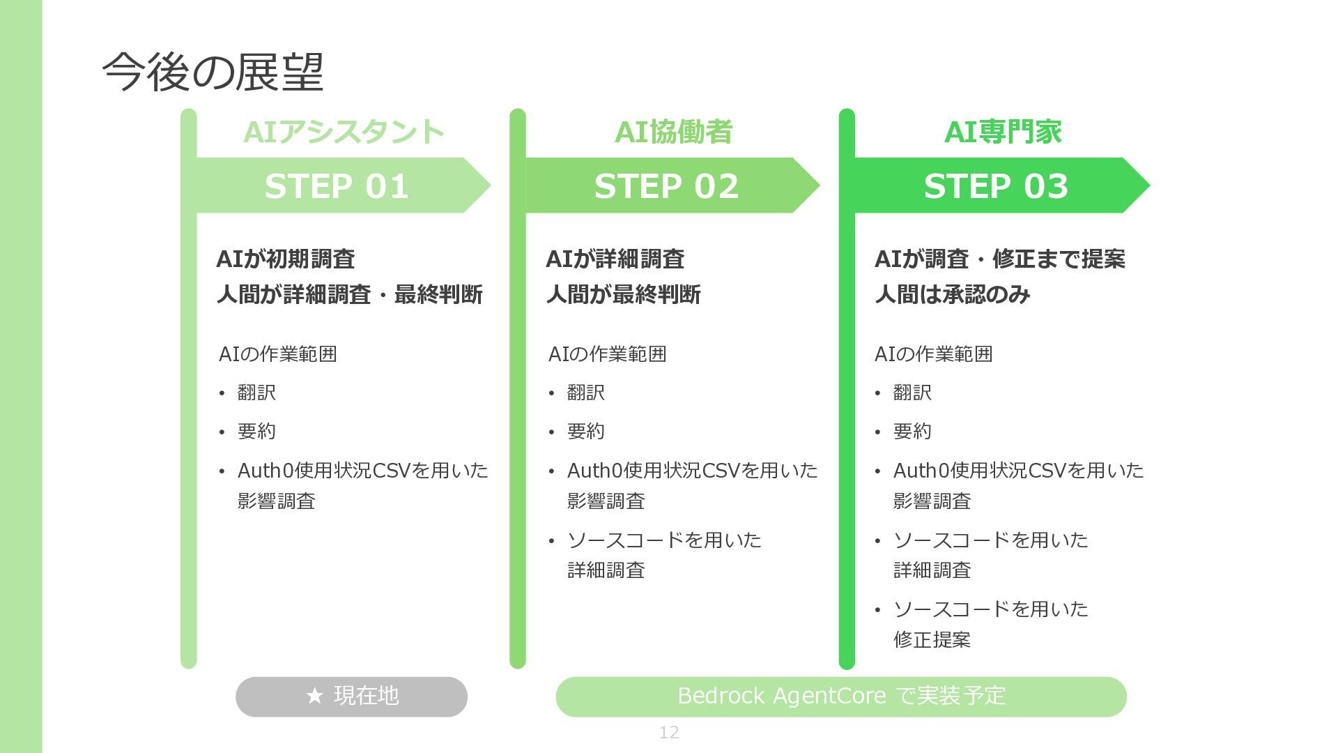 翻訳 • 要約 • Auth0使用状況CSVを用いた 影響調査 • ソースコードを用いた 詳細調査 • ソースコードを用いた 修正提案 STEP 01 AIアシスタント STEP 02 AI協働者 STEP 03 AI専門家 AIの作業範囲 • 翻訳 • 要約 • Auth0使用状況CSVを用いた 影響調査 AIの作業範囲 • 翻訳 • 要約 • Auth0使用状況CSVを用いた 影響調査 • ソースコードを用いた 詳細調査 ★ 現在地 Bedrock AgentCore で実装予定