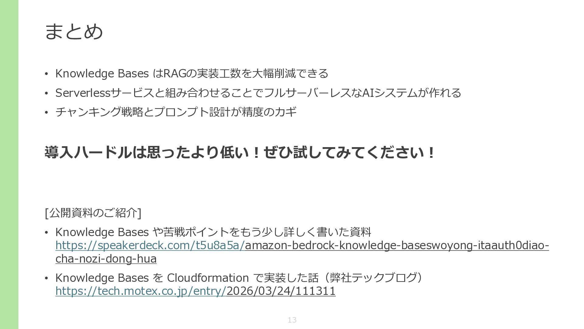 まとめ • Knowledge Bases はRAGの実装工数を大幅削減できる • Serverlessサービスと組み合わせることでフルサーバーレスなAIシステムが作れる • チャンキング戦略とプロンプト設計が精度のカギ 導入ハードルは思ったより低い!ぜひ試してみてください!