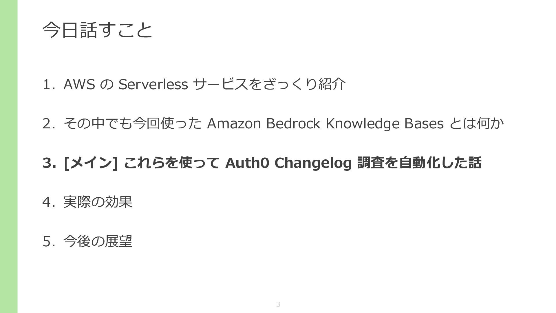 Knowledge Bases とは何か 3. [メイン] これらを使って Auth0 Changelog 調査を自動化した話 4. 実際の効果 5. 今後の展望 3