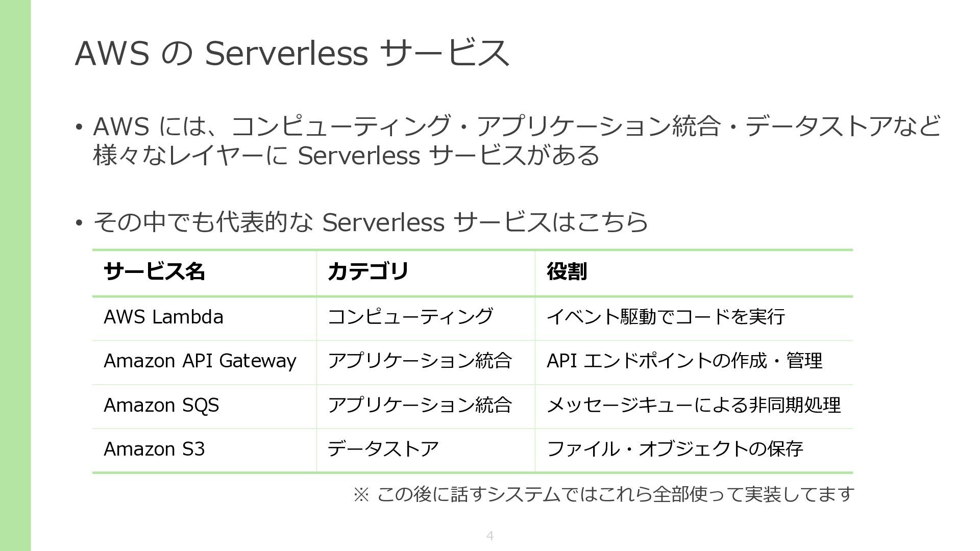 • その中でも代表的な Serverless サービスはこちら サービス名 カテゴリ 役割 AWS Lambda コンピューティング イベント駆動でコードを実行 Amazon API Gateway アプリケーション統合 API エンドポイントの作成・管理 Amazon SQS アプリケーション統合 メッセージキューによる非同期処理 Amazon S3 データストア ファイル・オブジェクトの保存 ※ この後に話すシステムではこれら全部使って実装してます 4