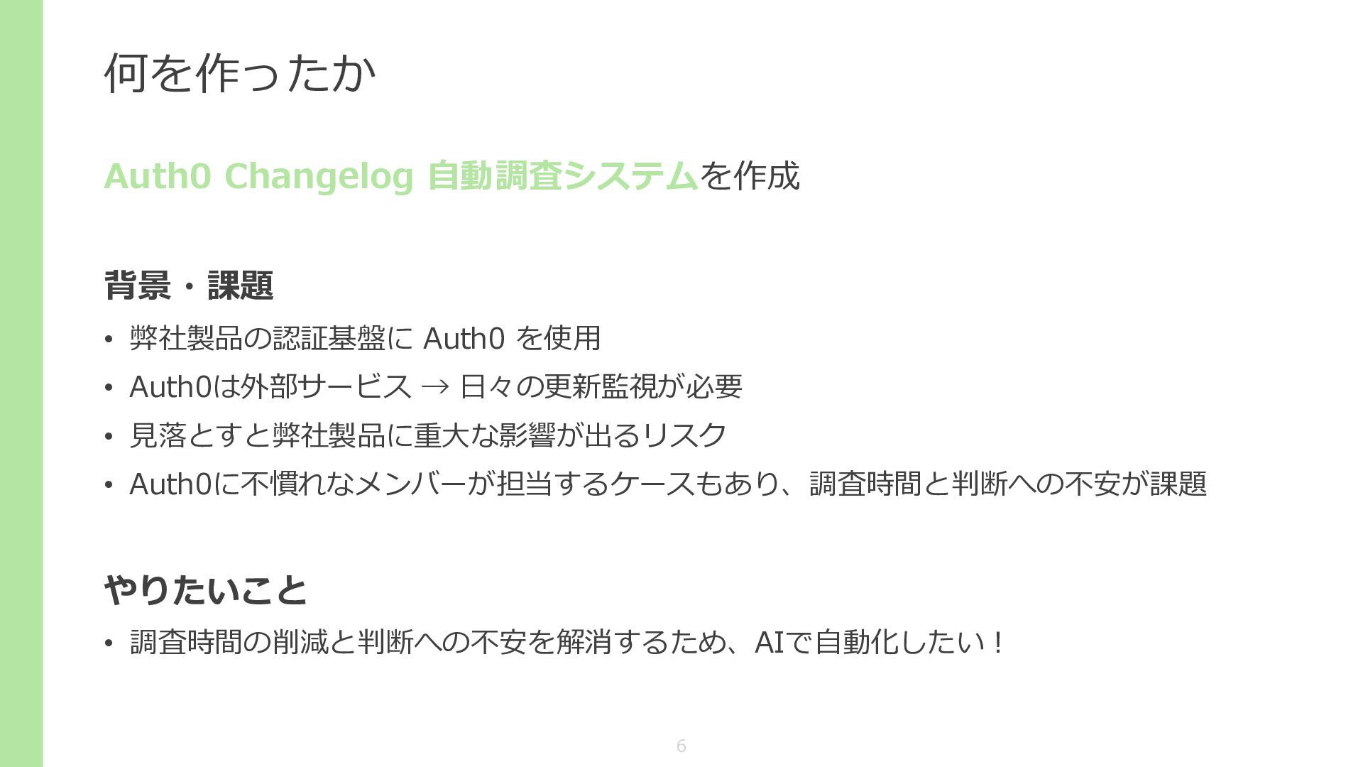 何を作ったか Auth0 Changelog 自動調査システムを作成 背景・課題 • 弊社製品の認証基盤に Auth0 を使用 •